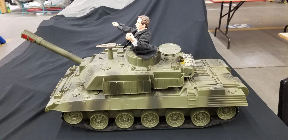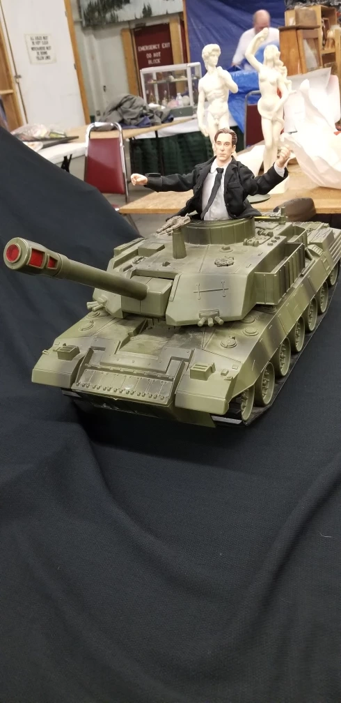 Hi , this is a business man riding a tank , Artist call this " war is profitable " . Signed on bottom from 1986 . Made of plastic , measures 24 inches long , 11 inches wide and 12 inches tall . Cash payment please , thanks for looking .
