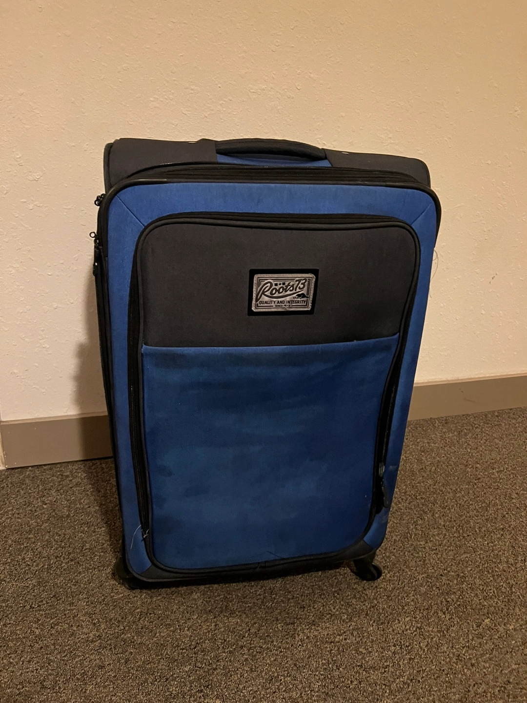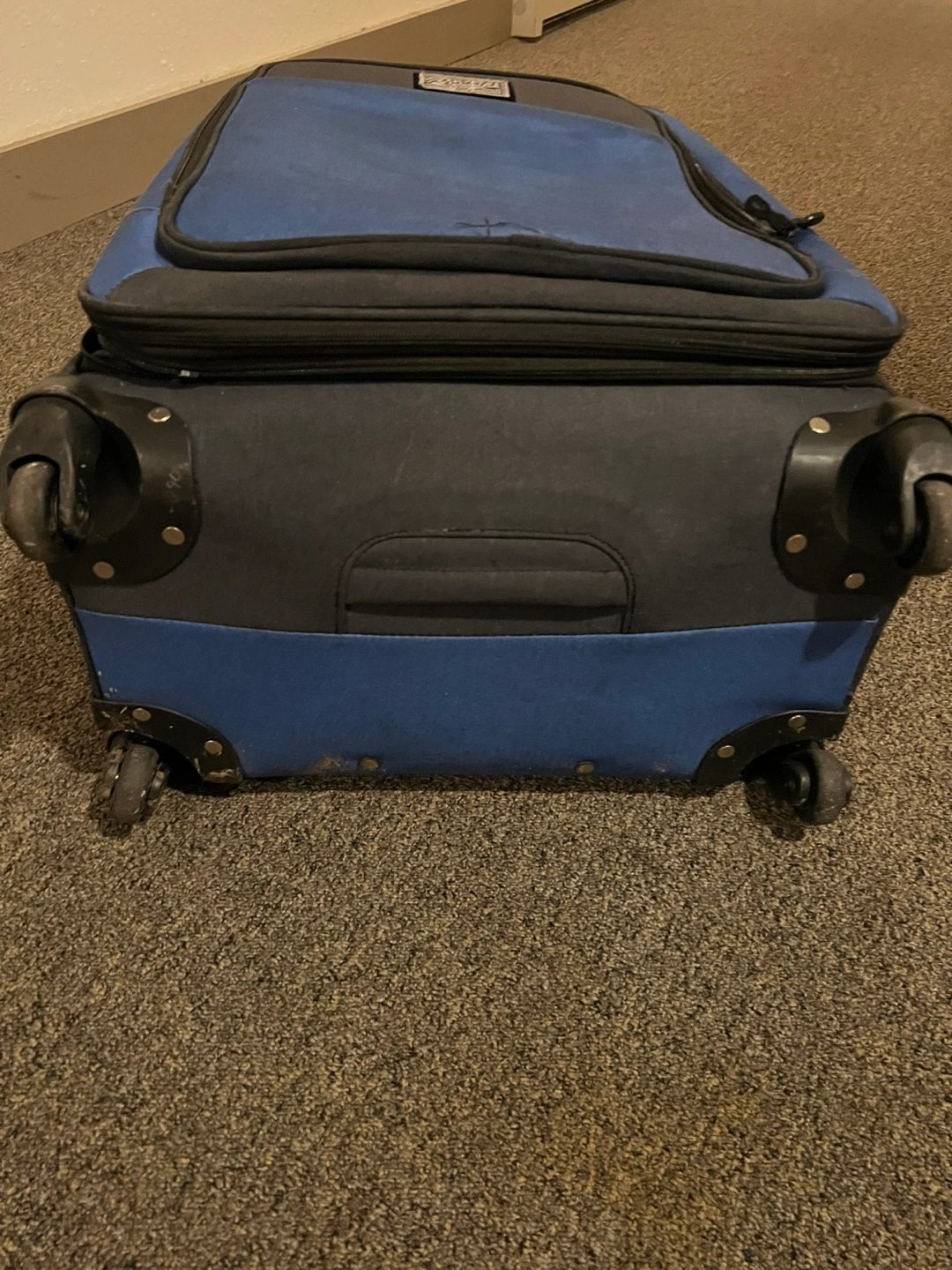Blue and grey rolling suitcase. Features four wheels, a telescopic handle, and interior compartments. Good for travel.28”x18” and 13” deep ,