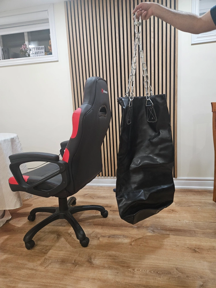 Black leather heavy bag. Includes chains for hanging. Great for home gym setup. Size Medium