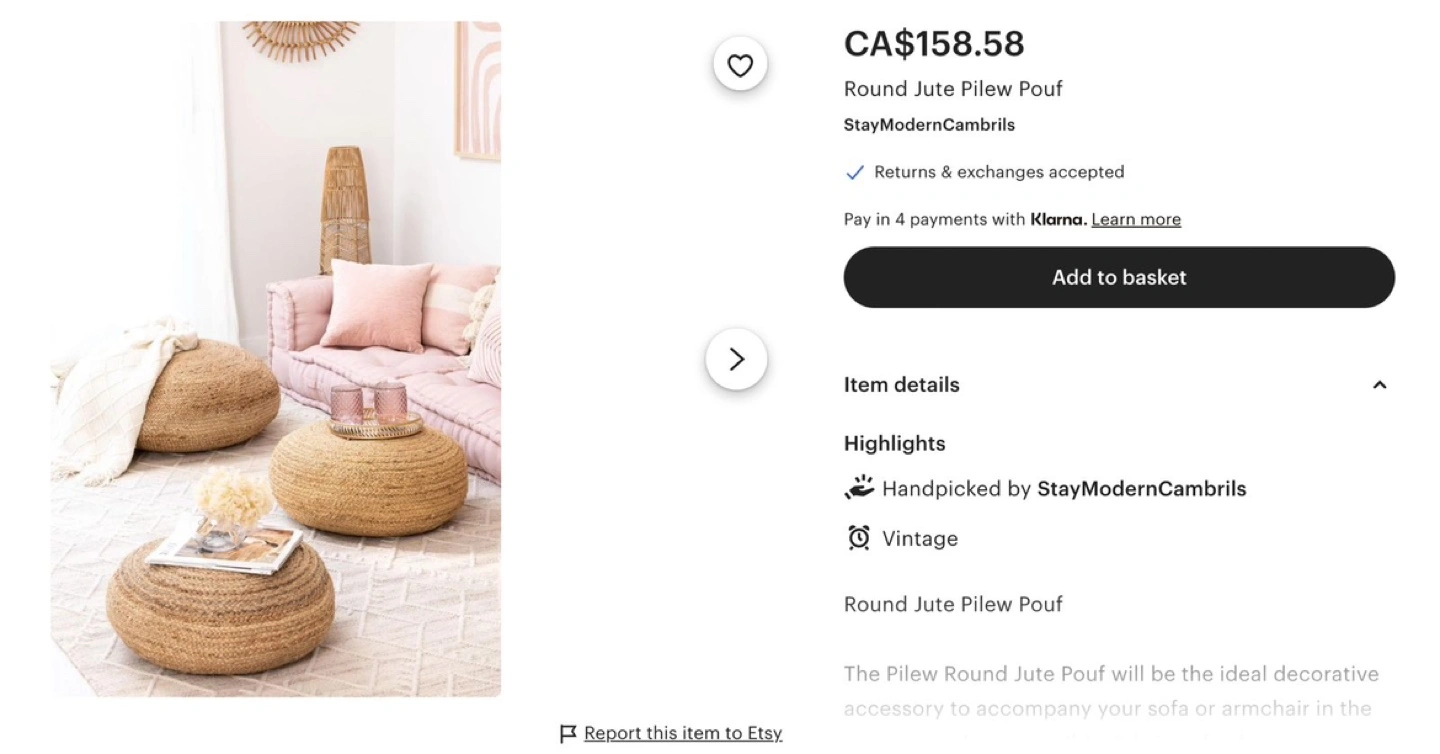 Buy & SellRound Boho Jute PoufRound Boho Jute Pouf$50Large round jute pouf. Super comfy boho seat. Comfortably fits adult.WHERE TO MEETWallace EmersonView MapSELLERverifiedimiHigh Park N1579 reviews2 chats·4 favorites·97 viewsSEND CHAT TO SELLERHi imi! I’m interested in your listing.Hi imi! I’m interested in your listing.Get the Karrot app to chatSign In to chat