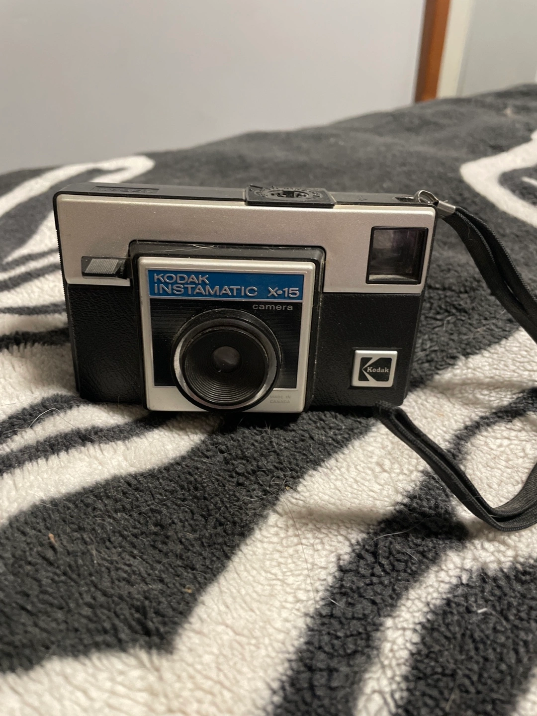 Kodak Instamatic X-15 camera. Black and silver body. Includes strap. Great condition. Perfect for collectors!