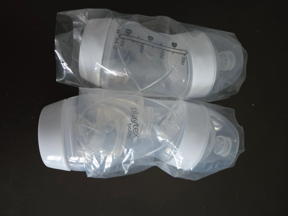 Two new Playtex Baby bottles. Clear plastic bottles with white collars. Individually packaged.
