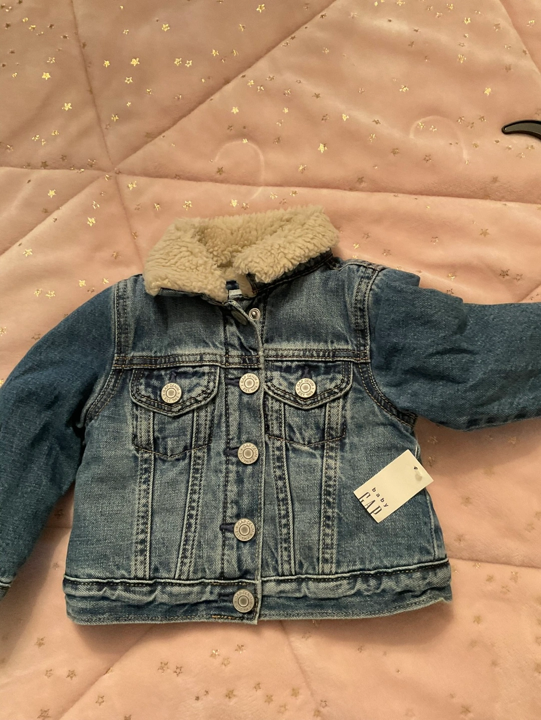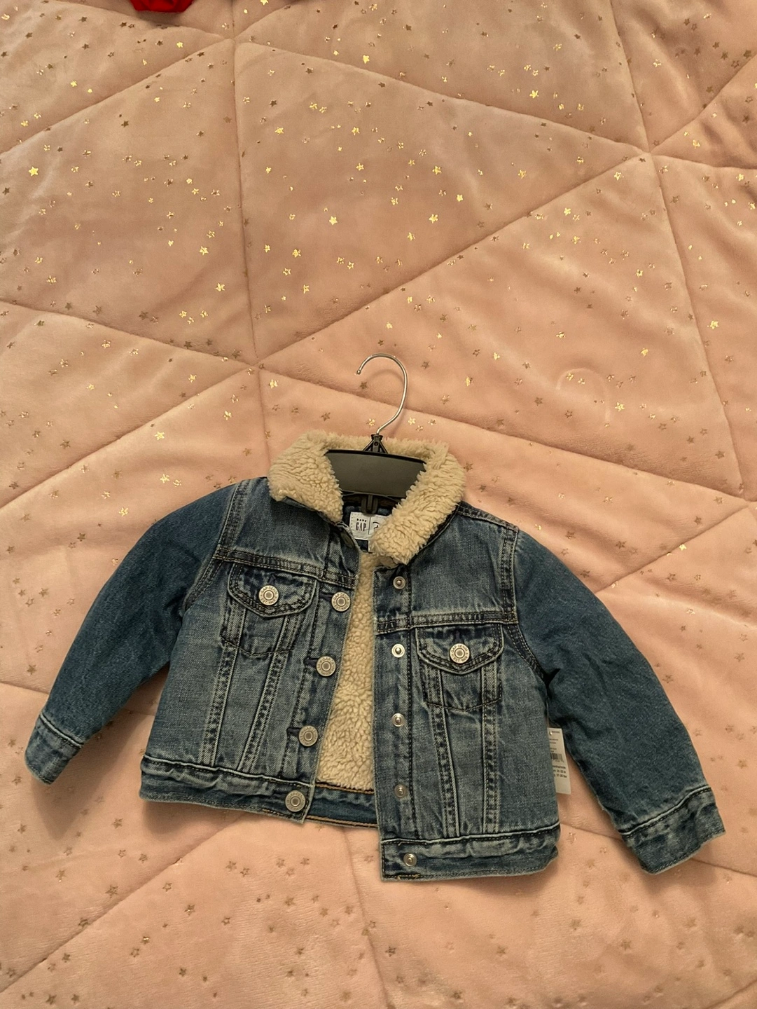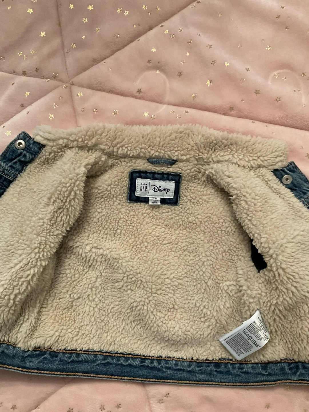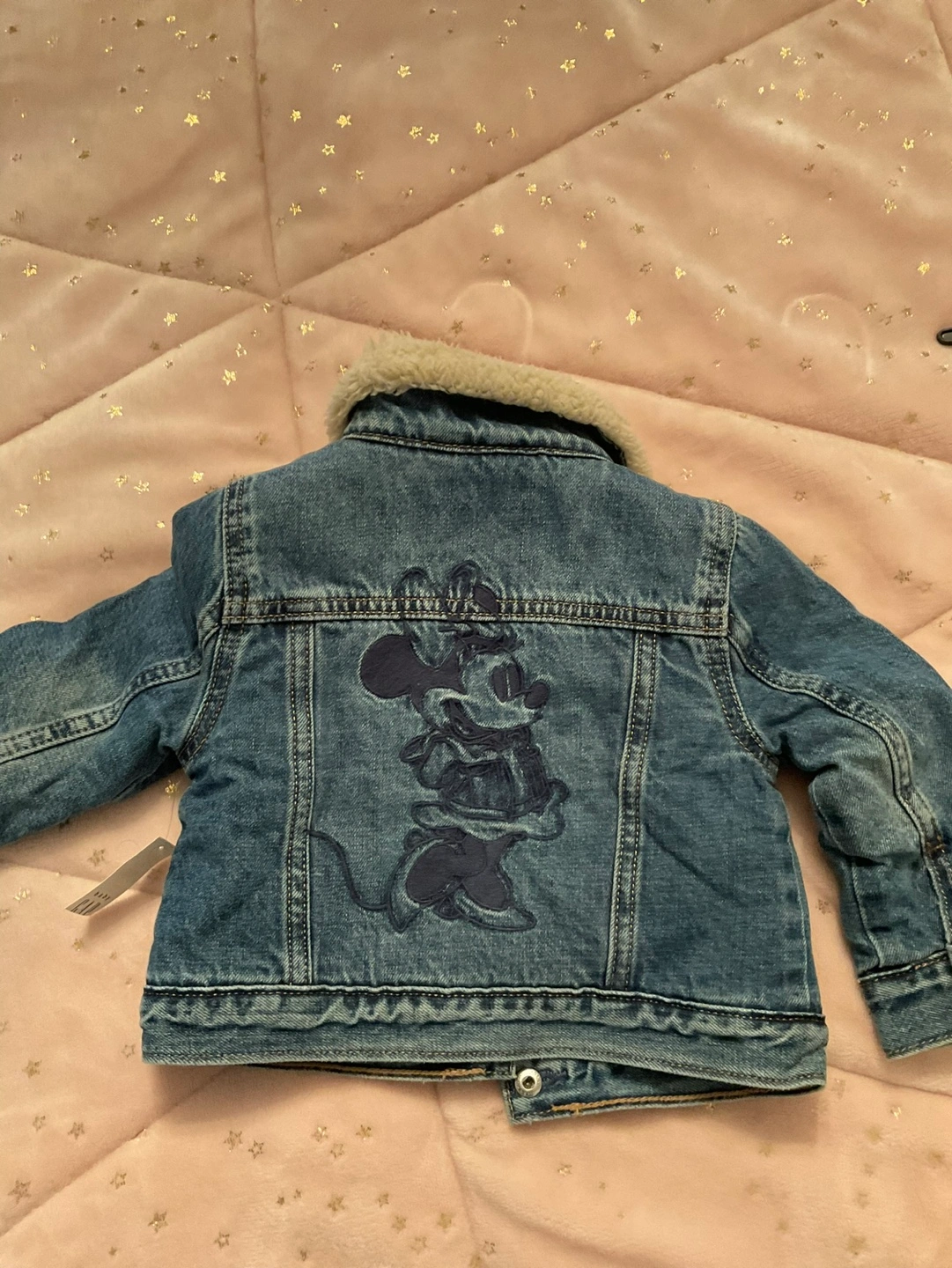 New with tag Adorable baby Gap denim Disney jacket. Features a sherpa collar and Mickey Mouse design. Size 18-24 months.