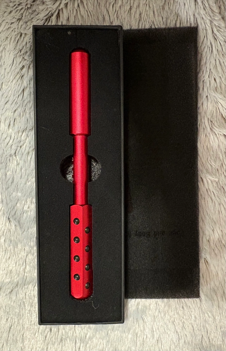 Red aluminum massage roller. 24 massaging stones. Easy to hold. Use on face and body. Comes in a black box with instructions.