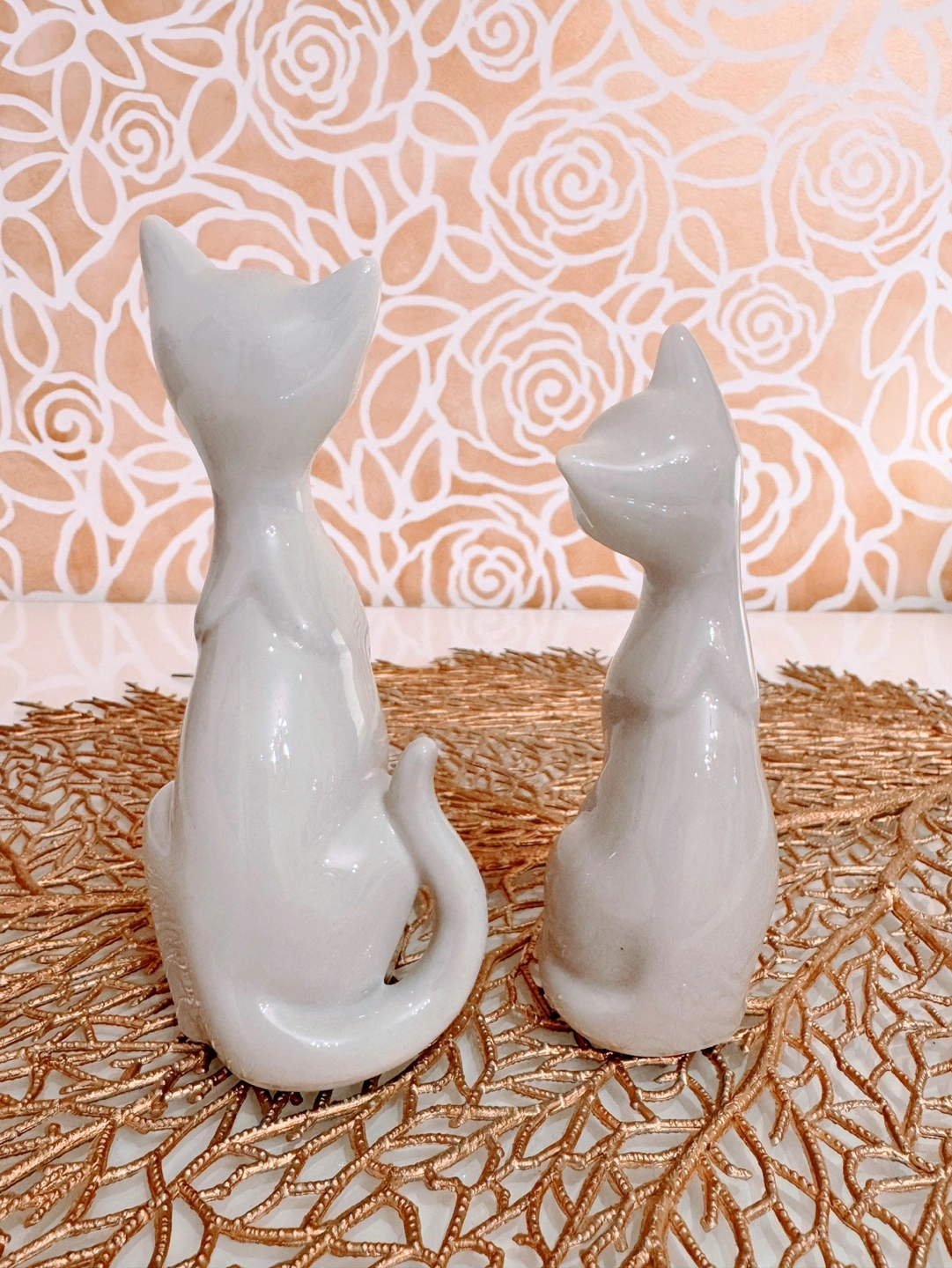 This is a lovely pair of porcelain kitty figurines made in Japan by Otagiri. They have such sweet faces! They have very soft and subtle gray coloration and their eyes and noses have a slight blue tone. Both have Otagiri Japan stickers.