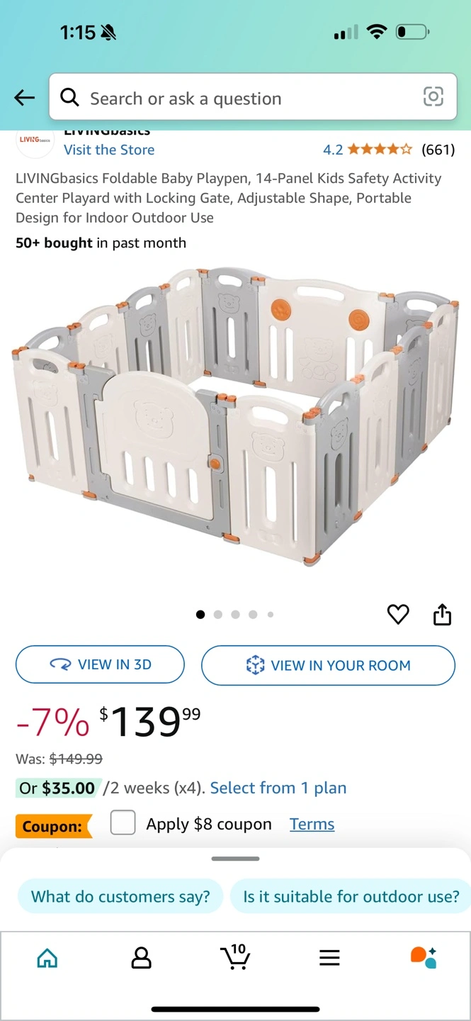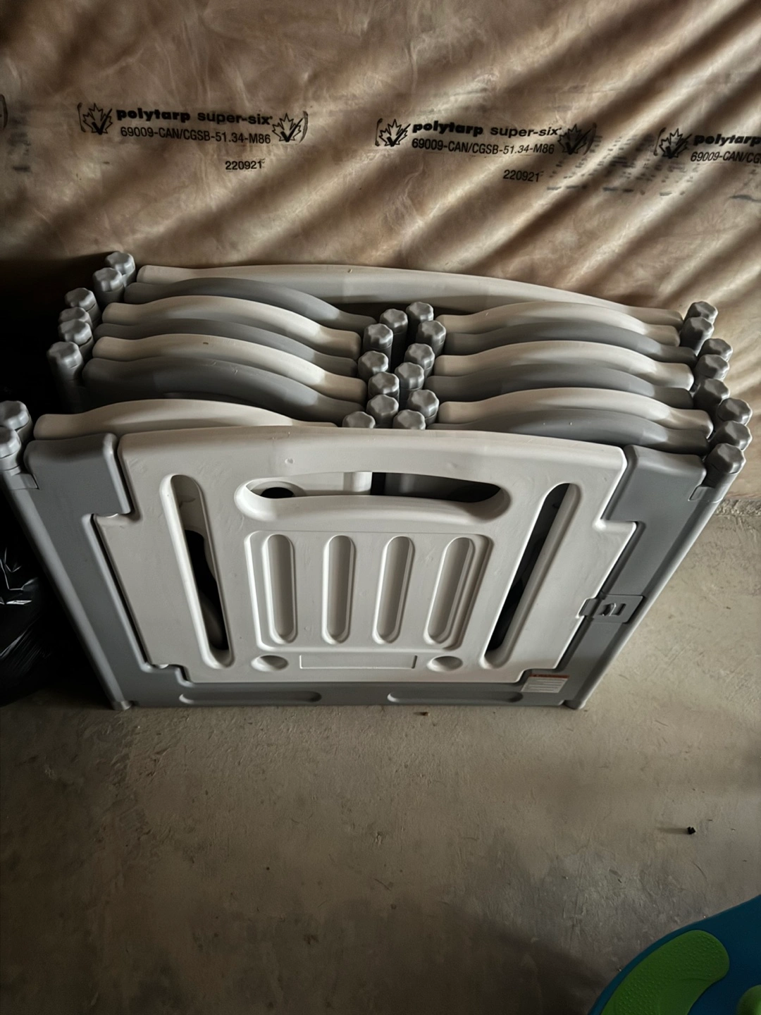Foldable playpen with fourteen panels. Indoor or outdoor use, Locking gate and adjustable shape with play panel! Hardly used