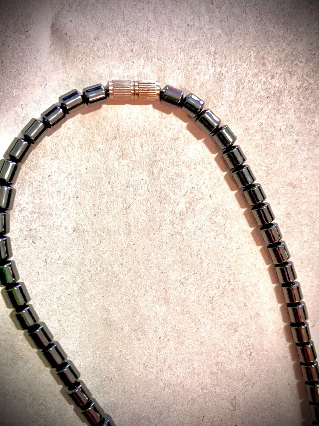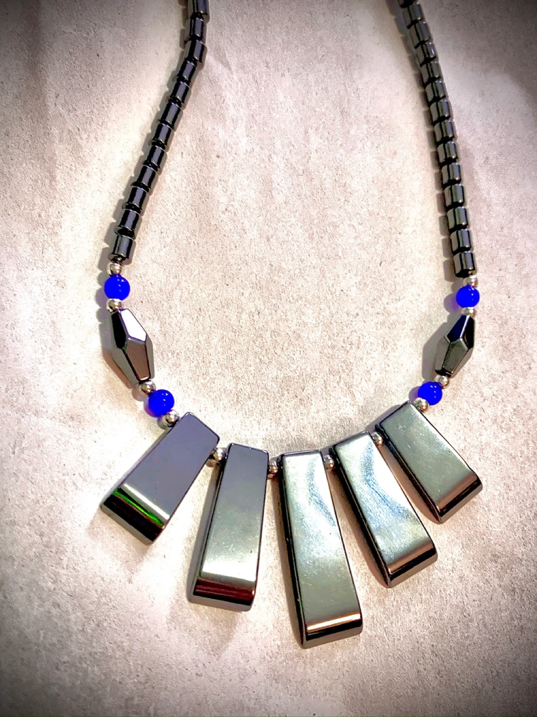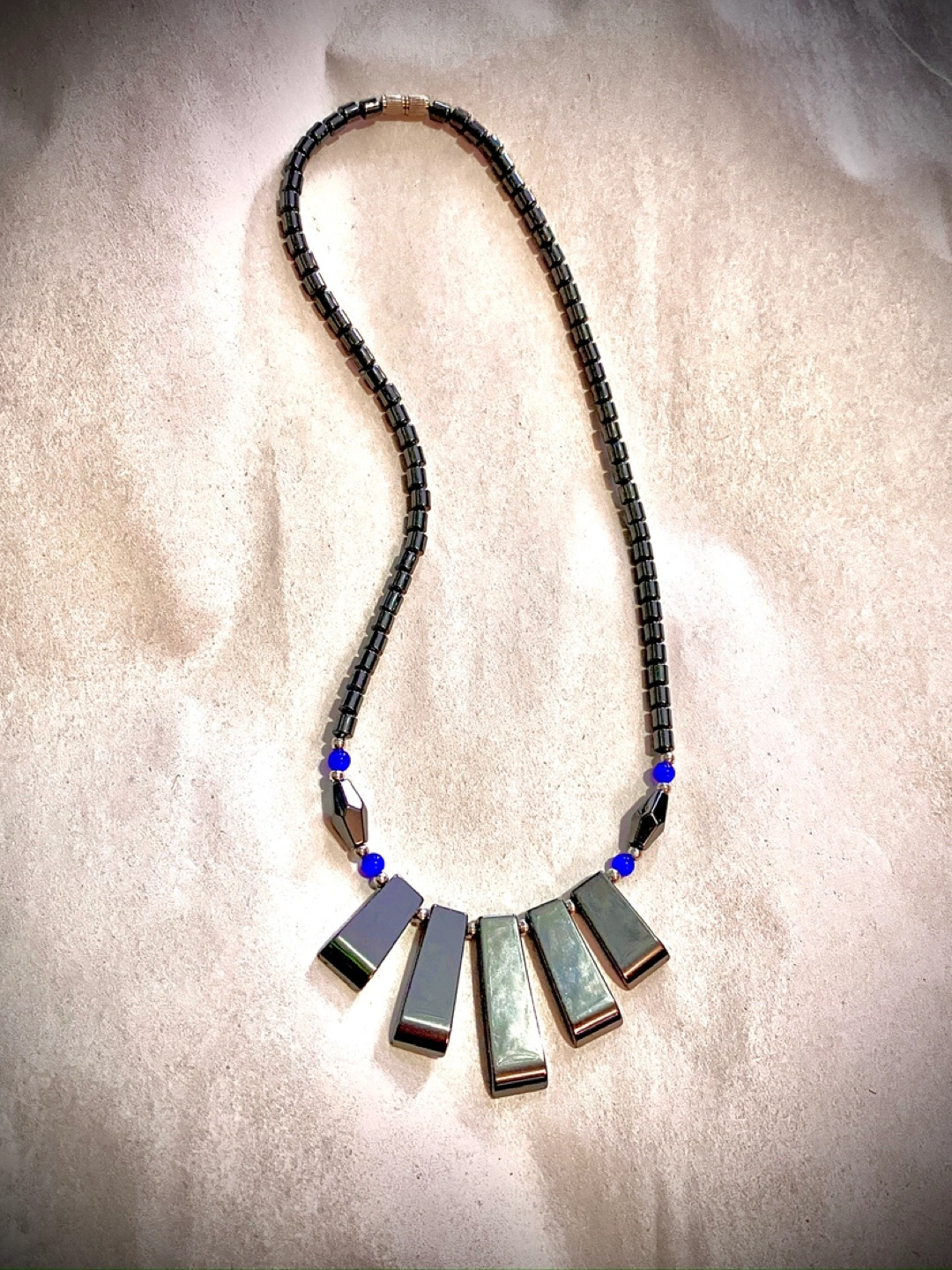 328Unique hematite necklace. Features five rectangular hematite pendants. Blue glass beads accent the hematite. Screw safety clasp. Pickup on Astoria Blvd South.