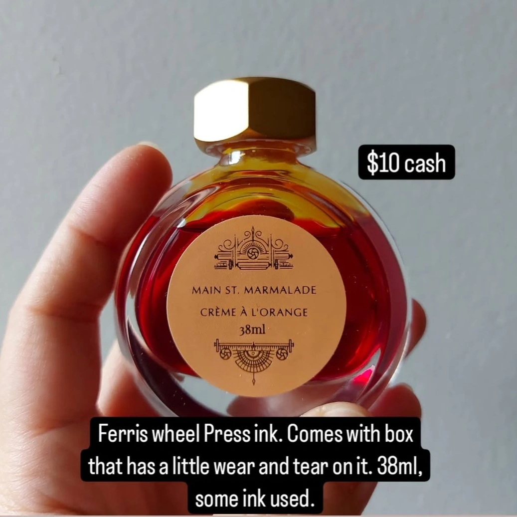 38ml bottle of Ferris Wheel Press Main St. Marmalade ink. Some ink used. Comes with box, minor wear and tear. $10 cash. Pick up at Pape Station. First picture is from my instagram.