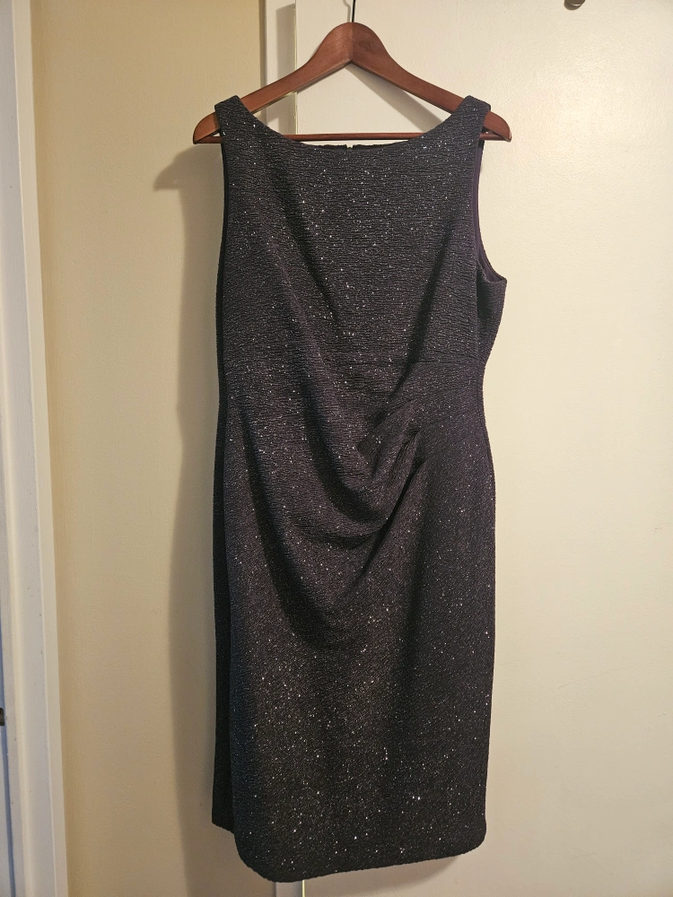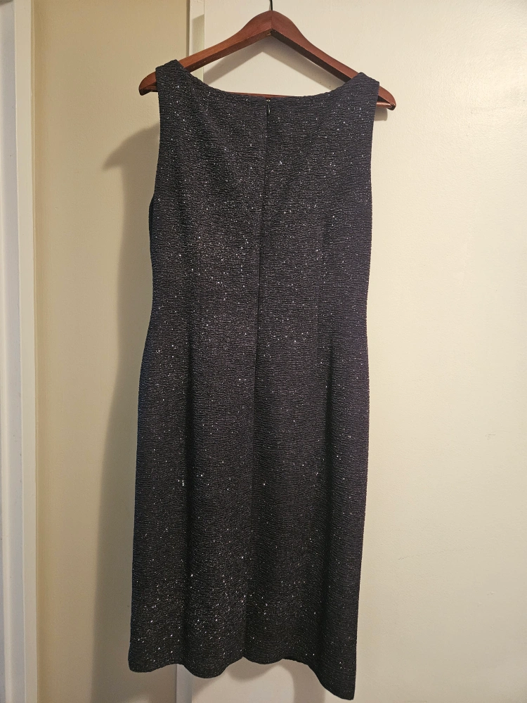 Sleeveless dark gray dress. Size 14. Subtle sparkly material. Boat neck. Back zipper. Worn once and can't fit into it anymore.