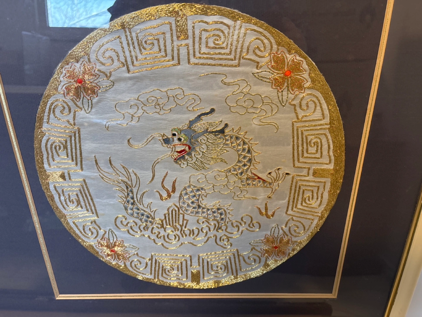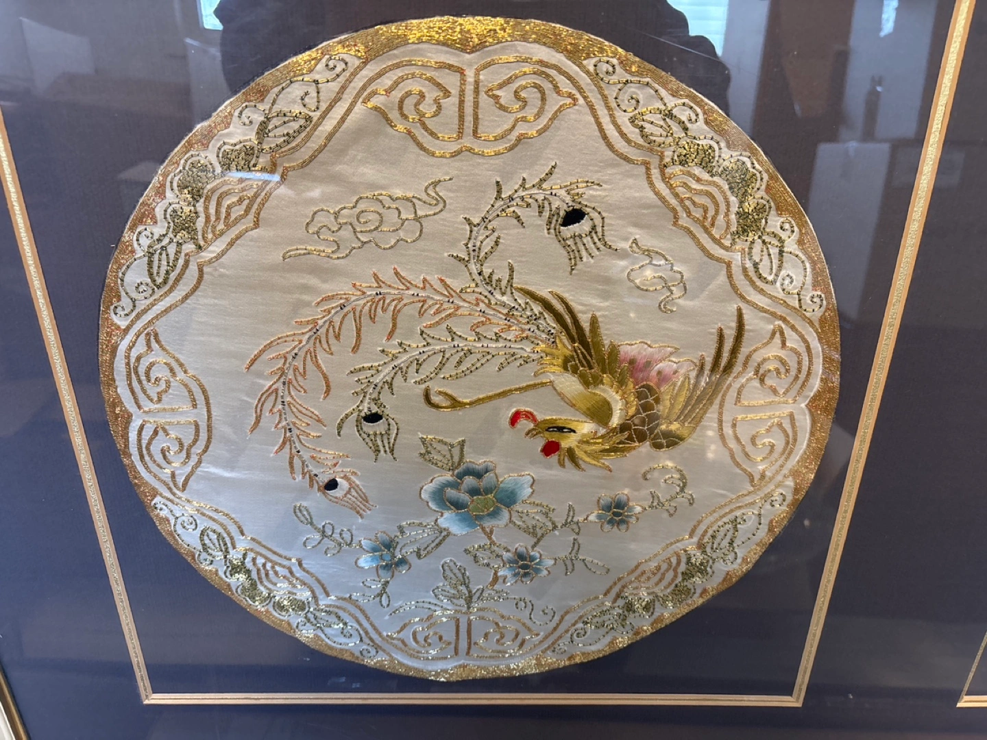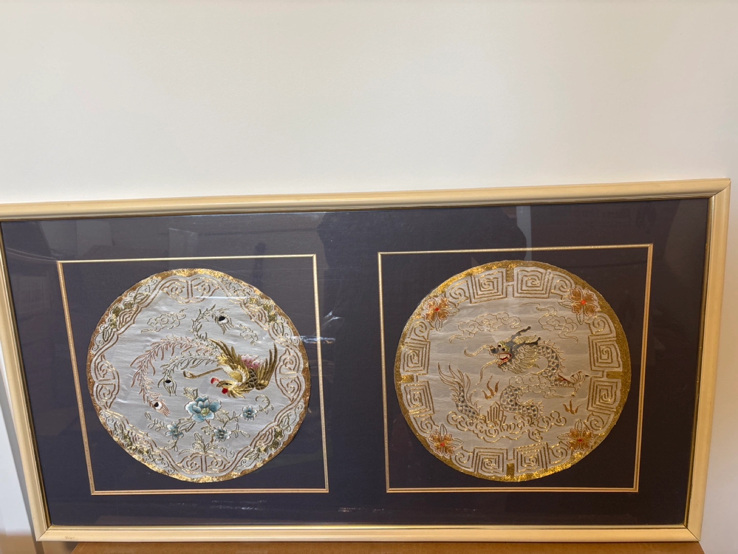 Beautiful pair of framed circular wall hangings. Intricate embroidery featuring a dragon and phoenix. Gold accents on off-white silk. Elegant addition to any home décor.