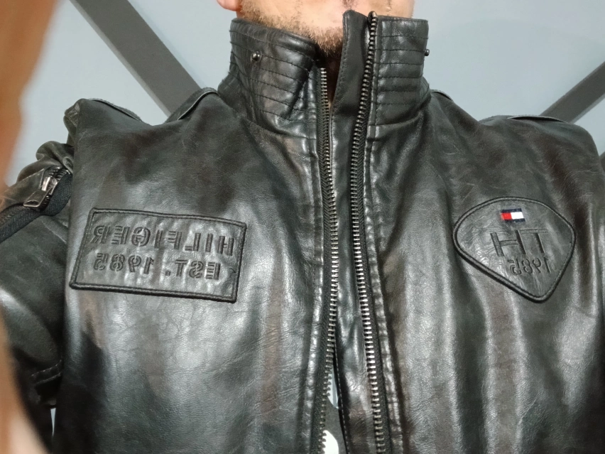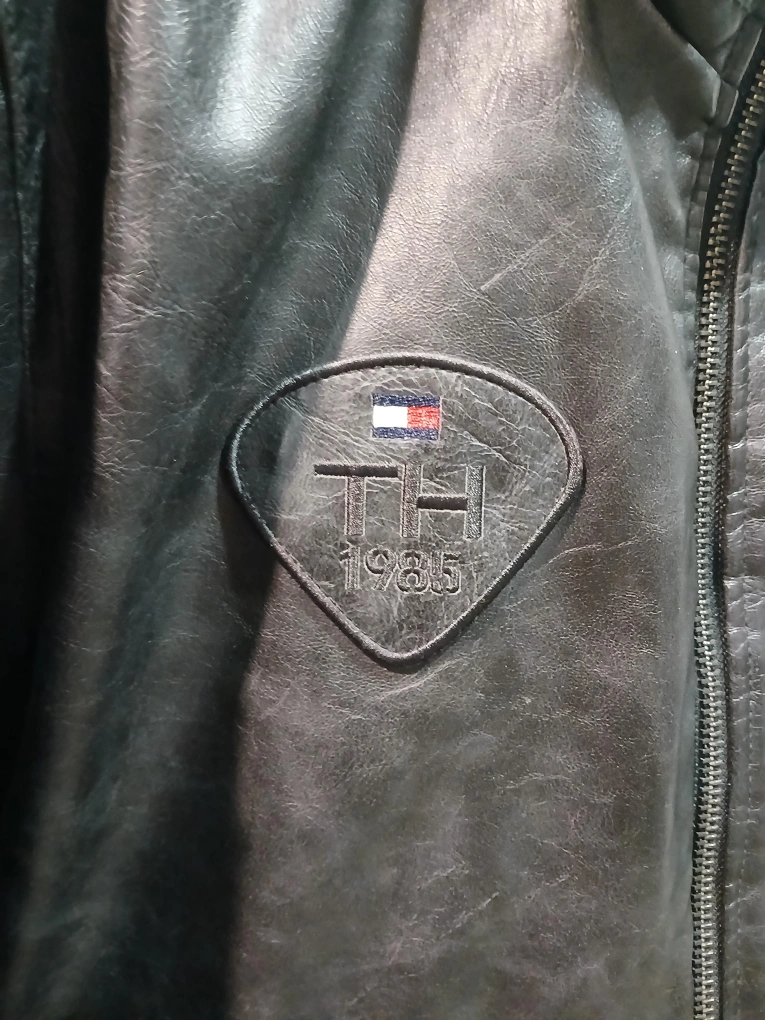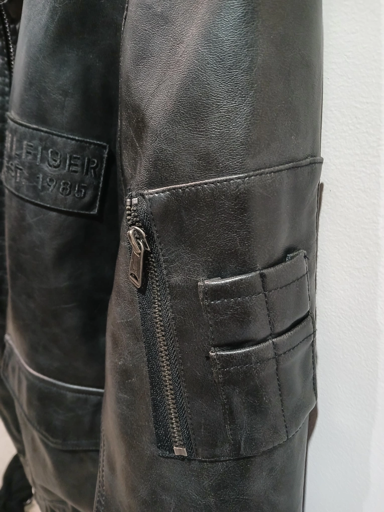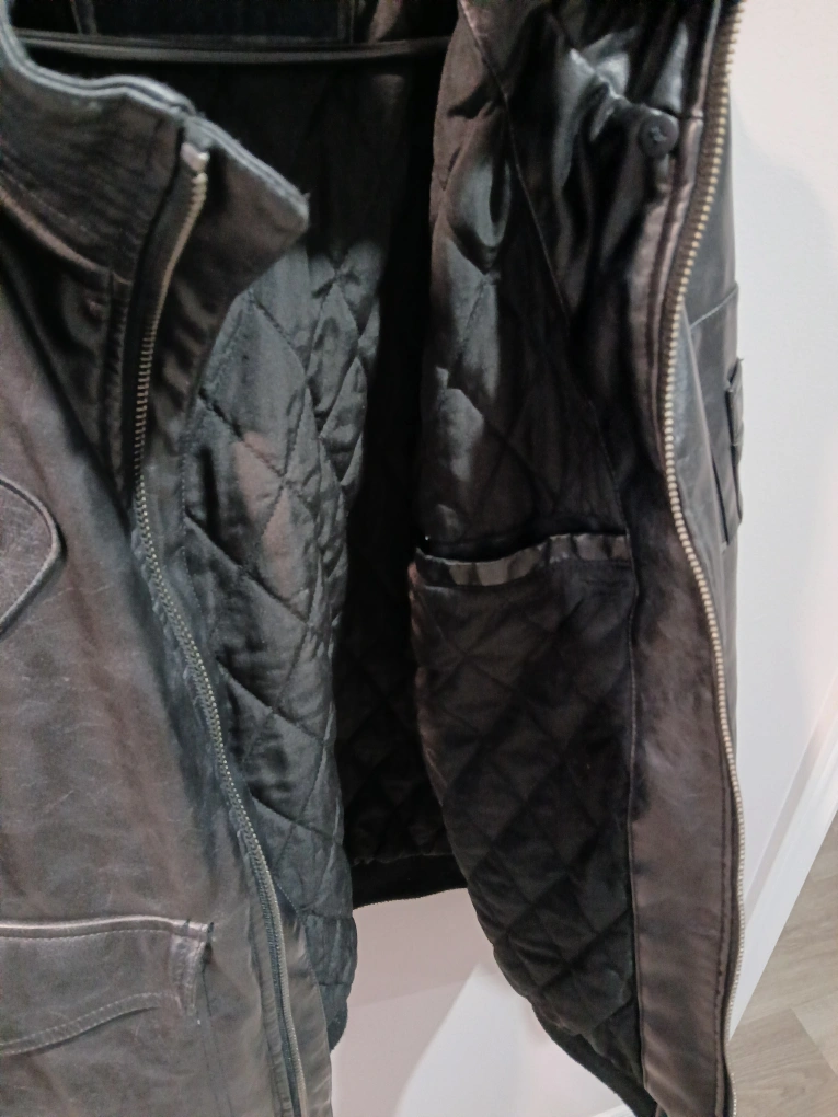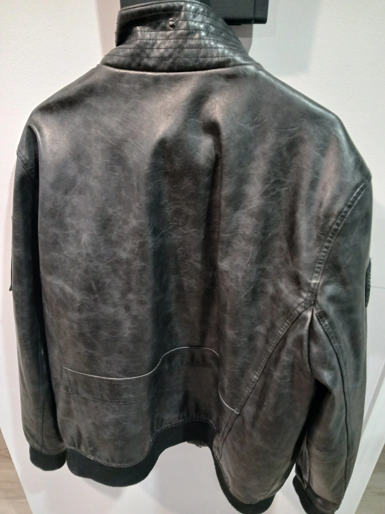 Men's black leather jacket. Features a sherpa lined collar, zipper closure, and multiple pockets. Good condition. Size not specified.