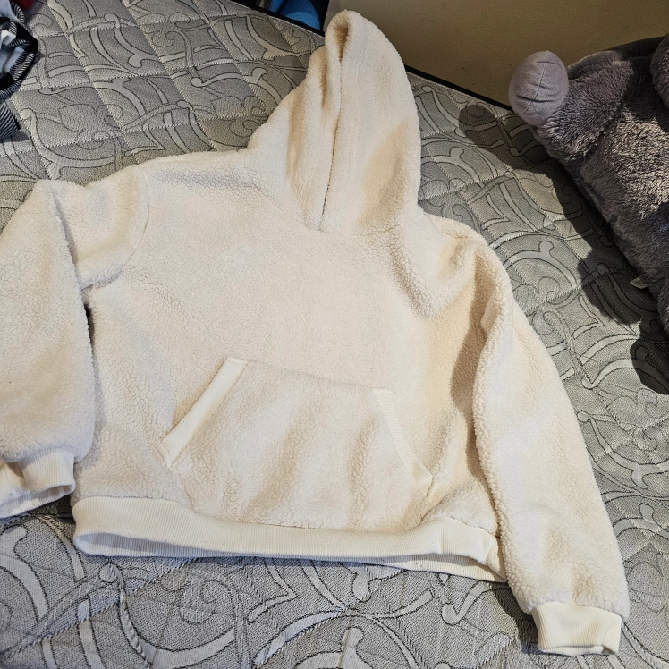 10Warm and cozy cream-coloured sherpa hoodie. Features a front pouch pocket and drawstring hood. Size XL/TG (14-16). Gently used.