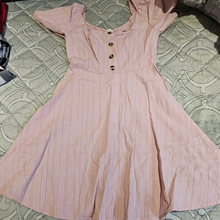 10Adorable pink mini dress. Features short puff sleeves, a square neckline, and a button placket. Made of a lightweight, breathable fabric. Perfect for warm weather.