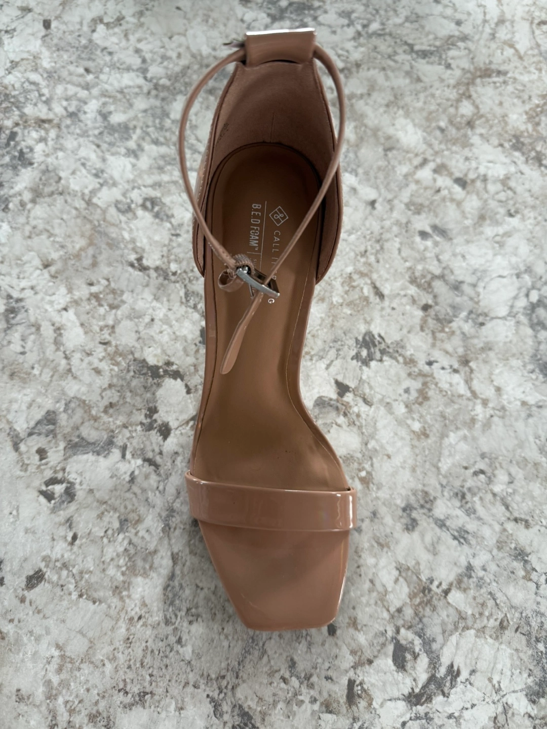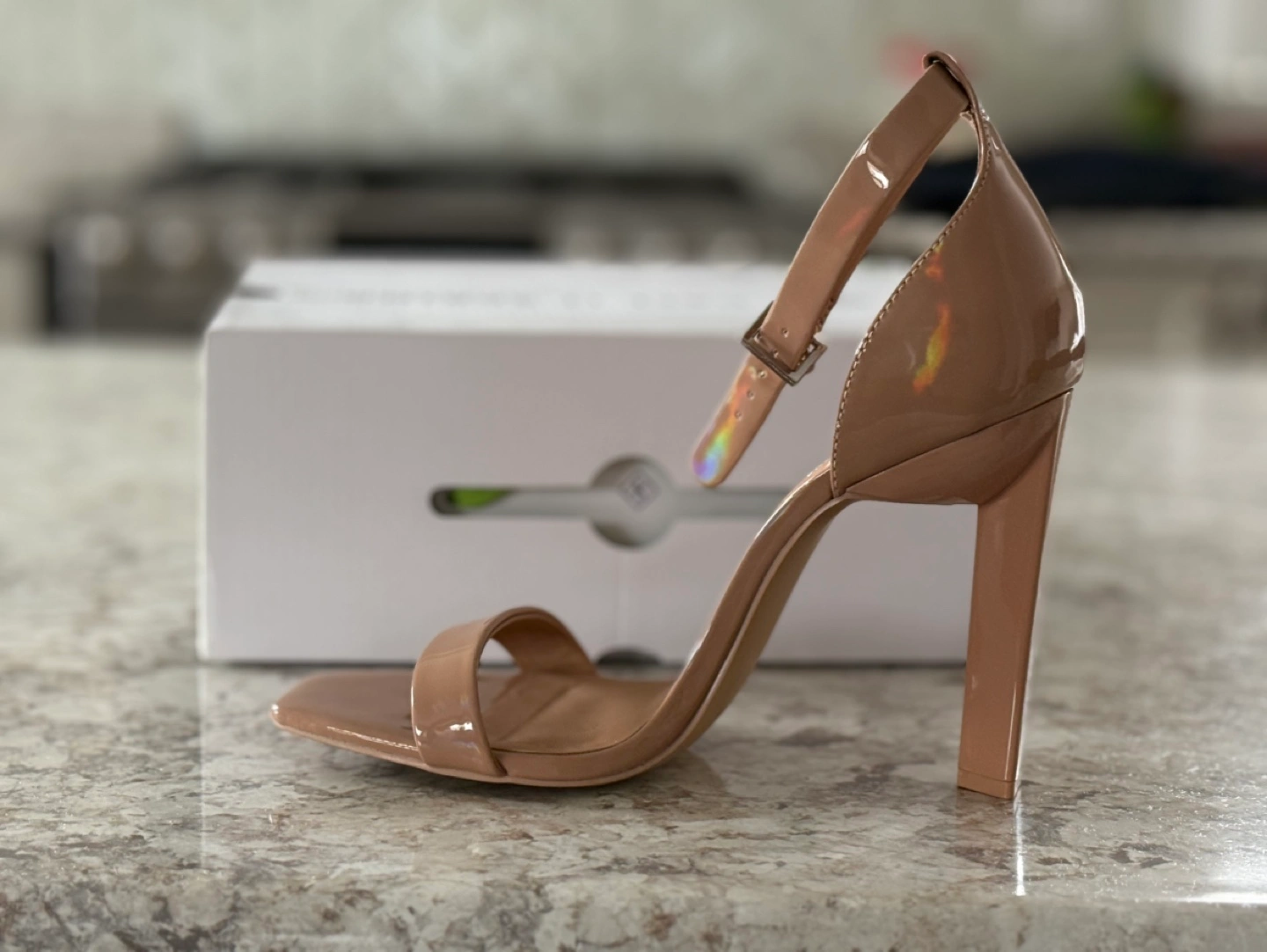Beautiful nude patent leather heels. Ankle strap with tie detail. Square toe. Block heel. New, unworn.
