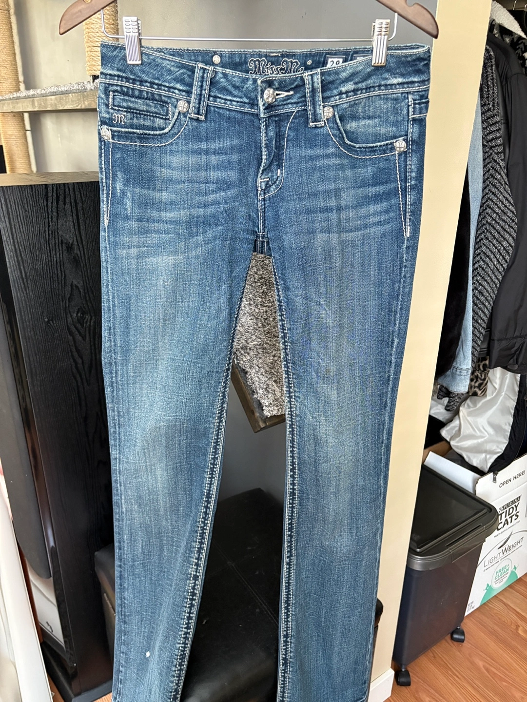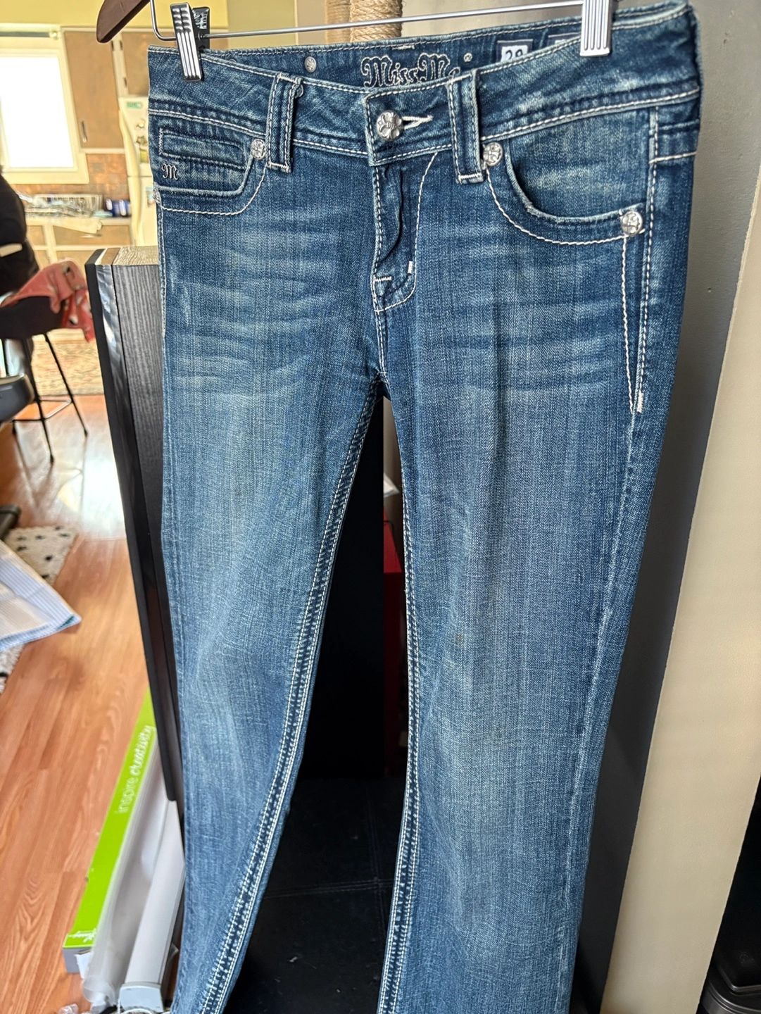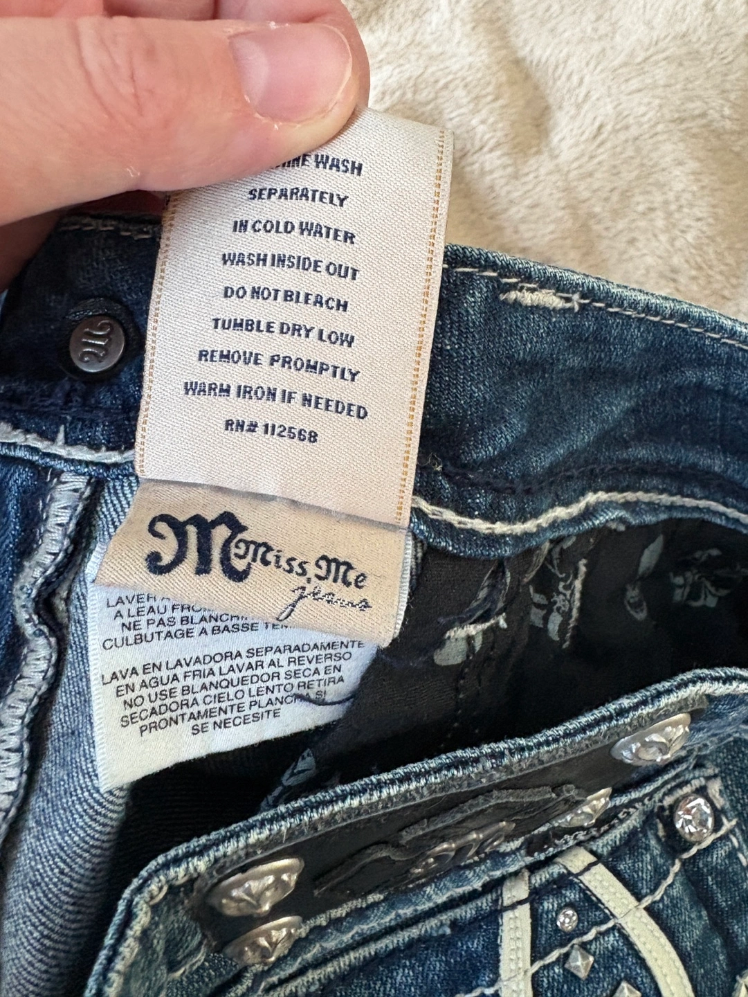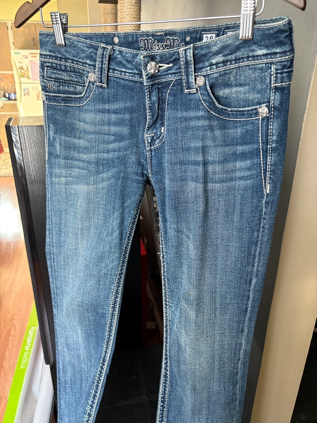 Lightly used Miss Me jeans. Size 26. Bootcut style. Embellished back pockets. Distressed denim.
