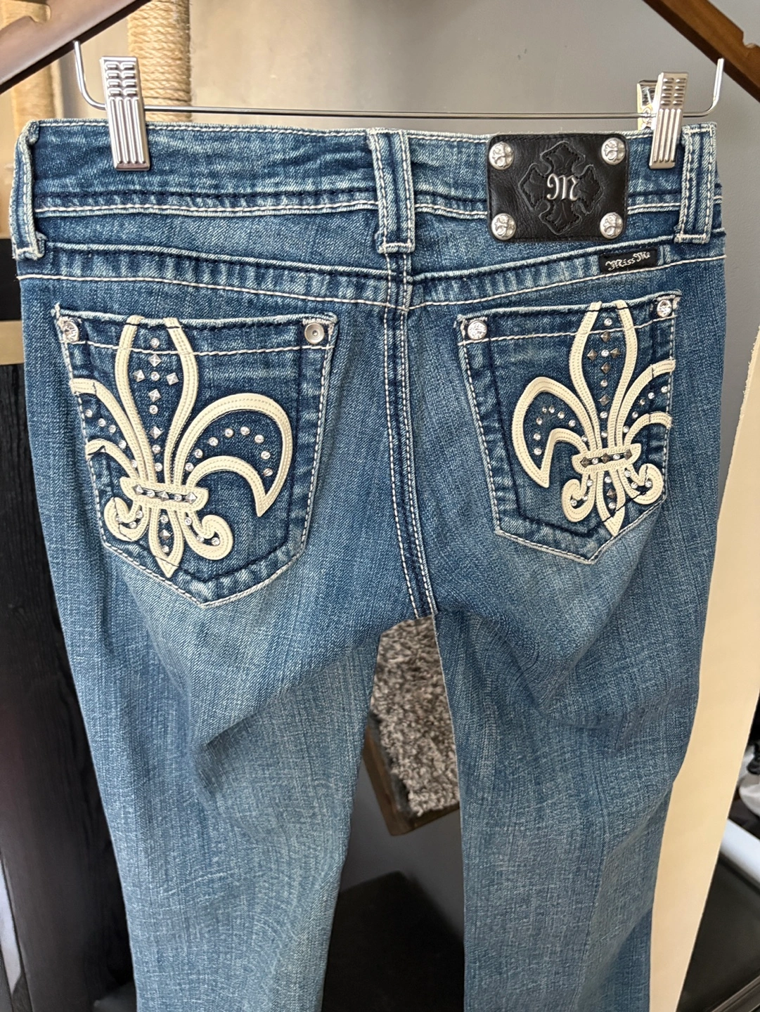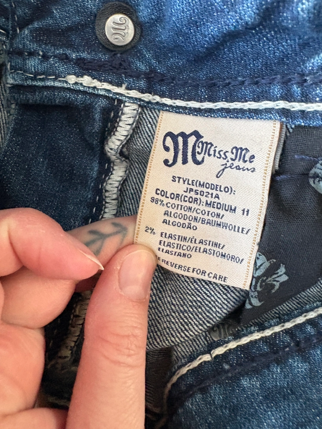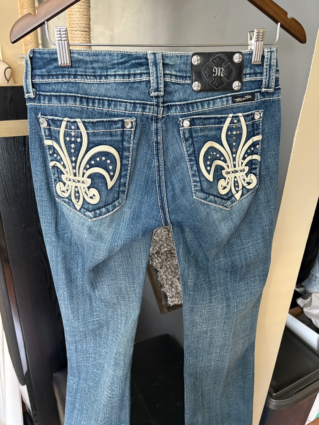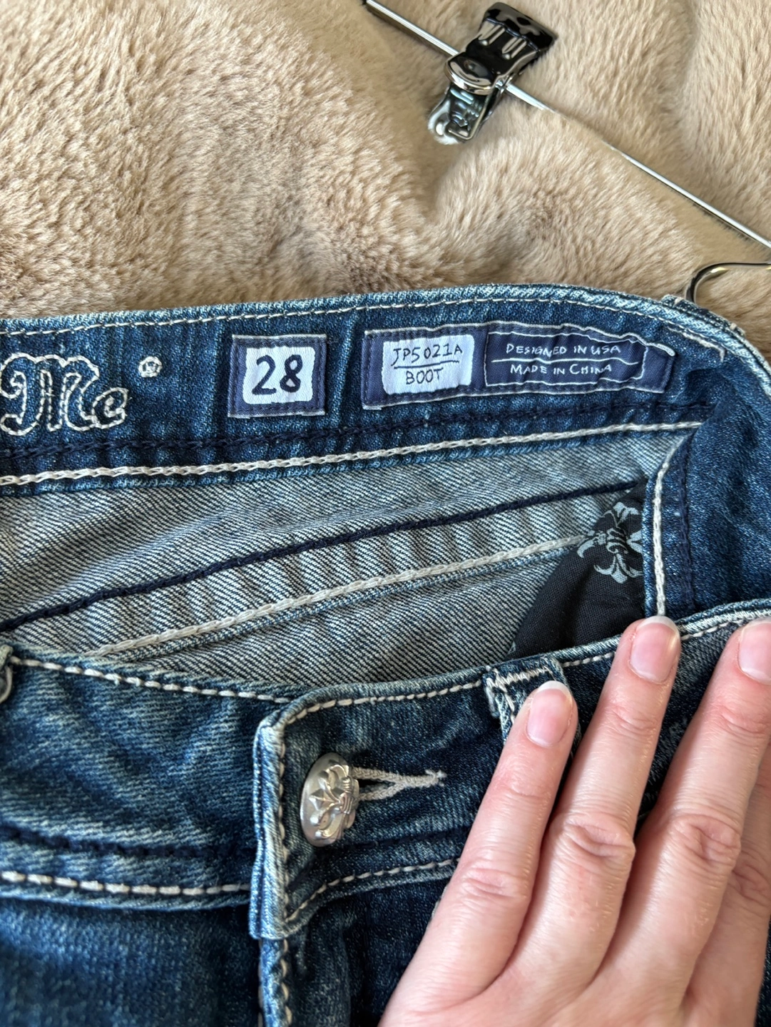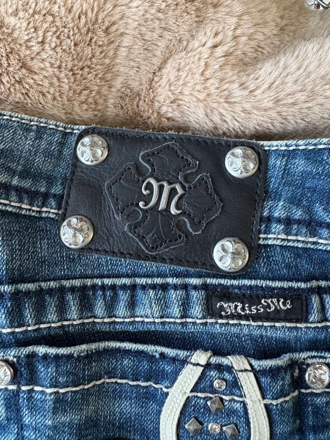 Lightly used Miss Me jeans. Size 26. Bootcut style. Embellished back pockets. Distressed denim.