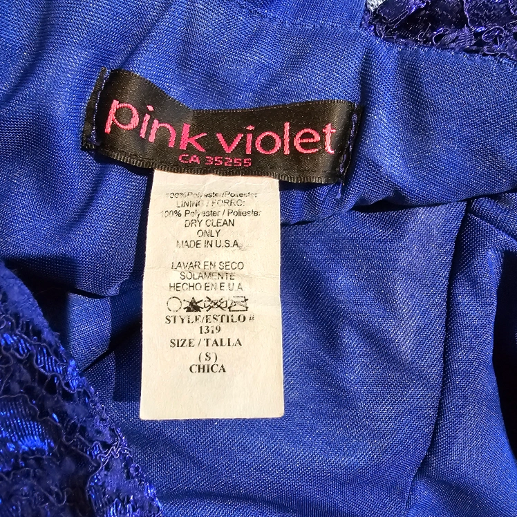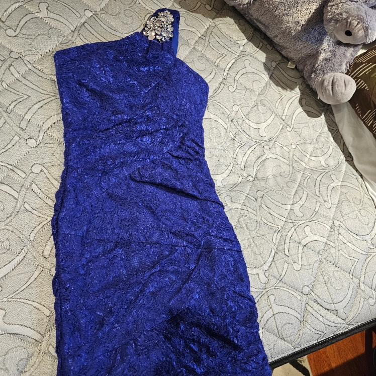 10Stunning royal blue lace dress. One-shoulder design. Features a rhinestone embellishment. Size small. Dry clean only.
