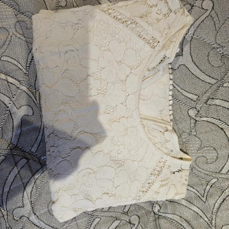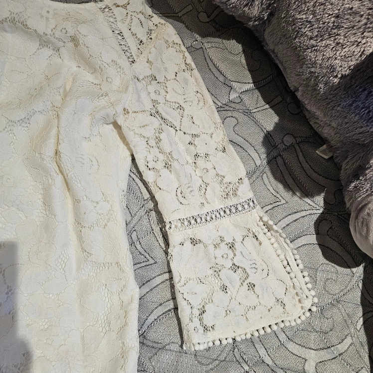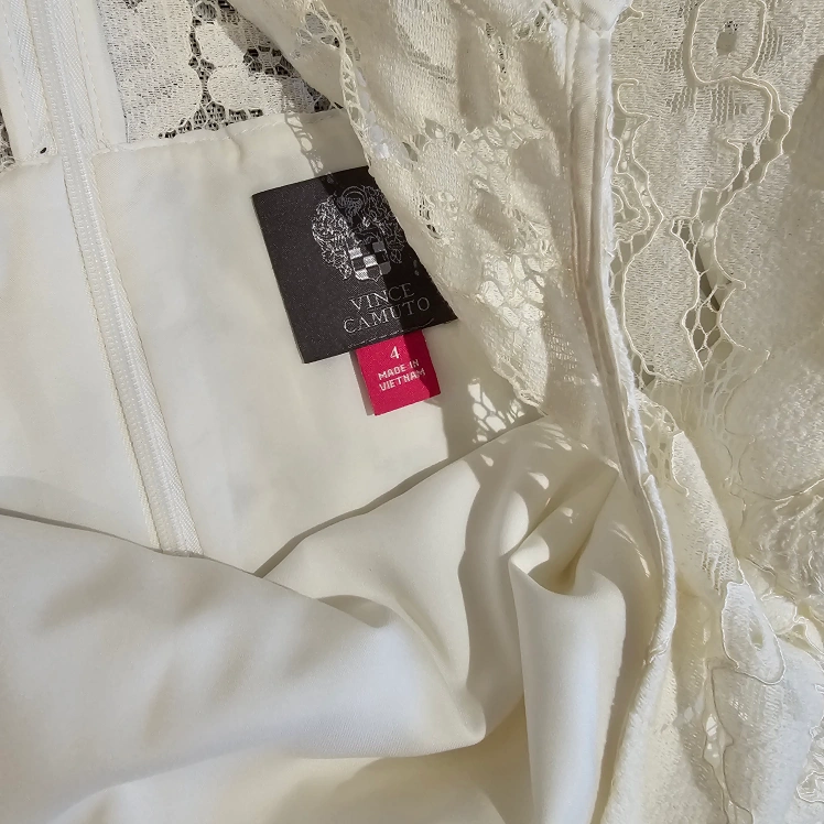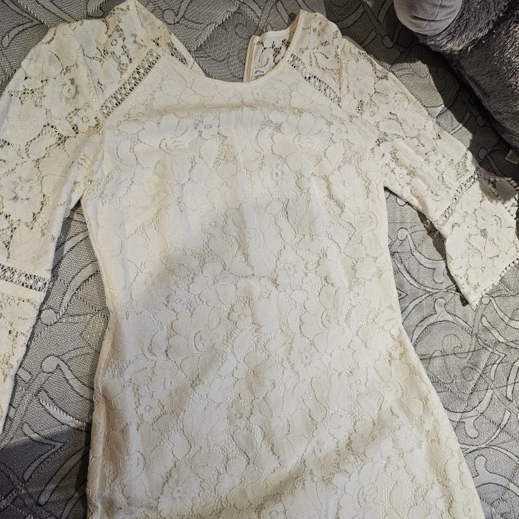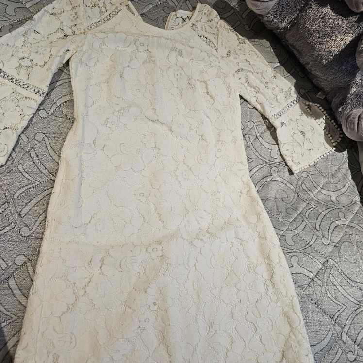 10Beautiful off-white lace dress. Three-quarter sleeves. Size 4. Back zipper closure.