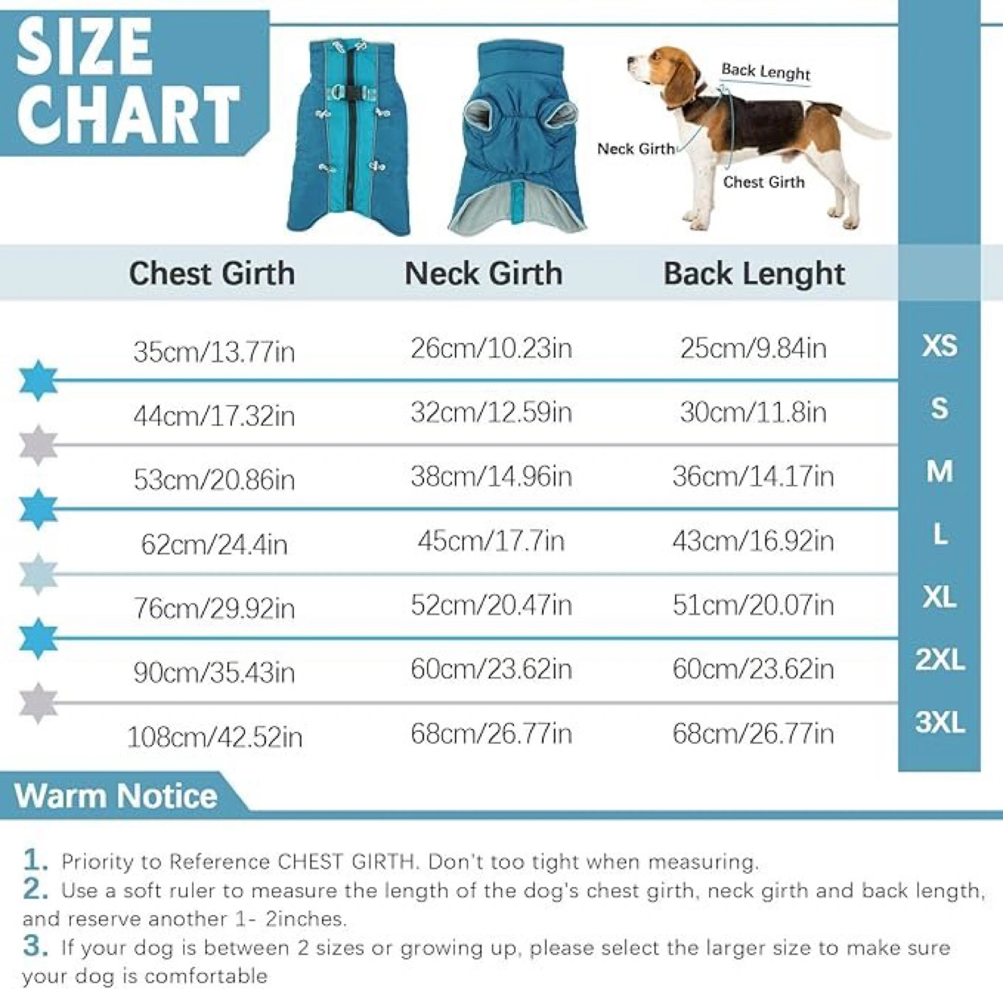 Keeps your dog warm and stylish. Waterproof and windproof. Features a soft fleece lining. Size small. Check size chart for accurate measurements.