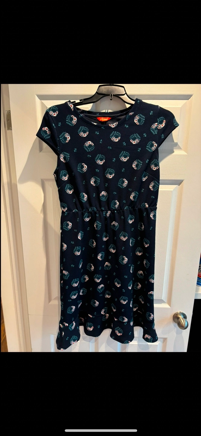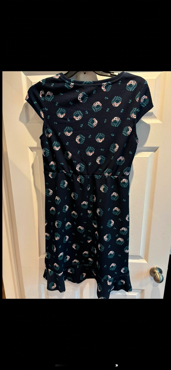 Navy blue dress with a floral pattern. Short sleeves and a ruffled hem. Size medium. New with tags.
