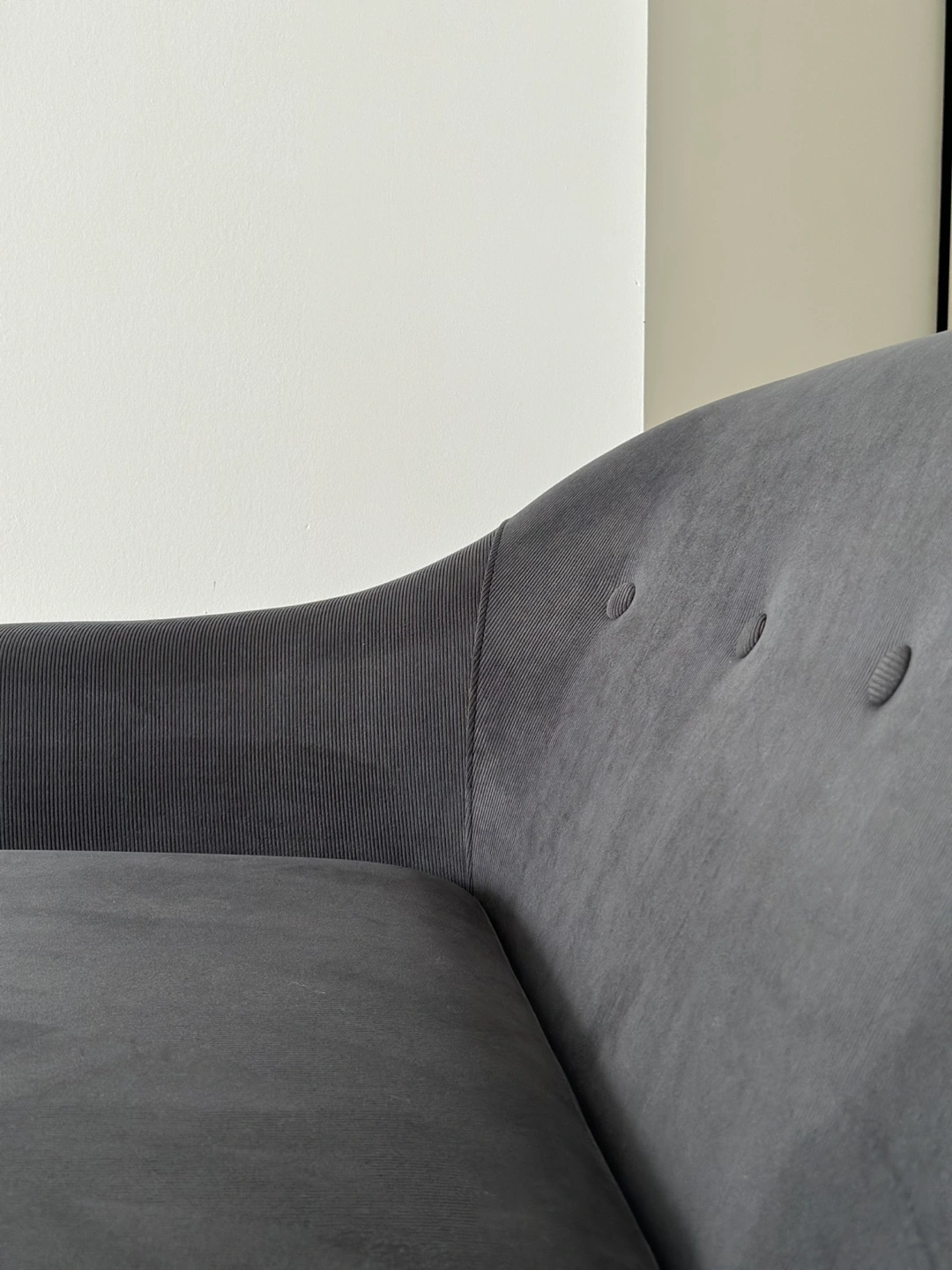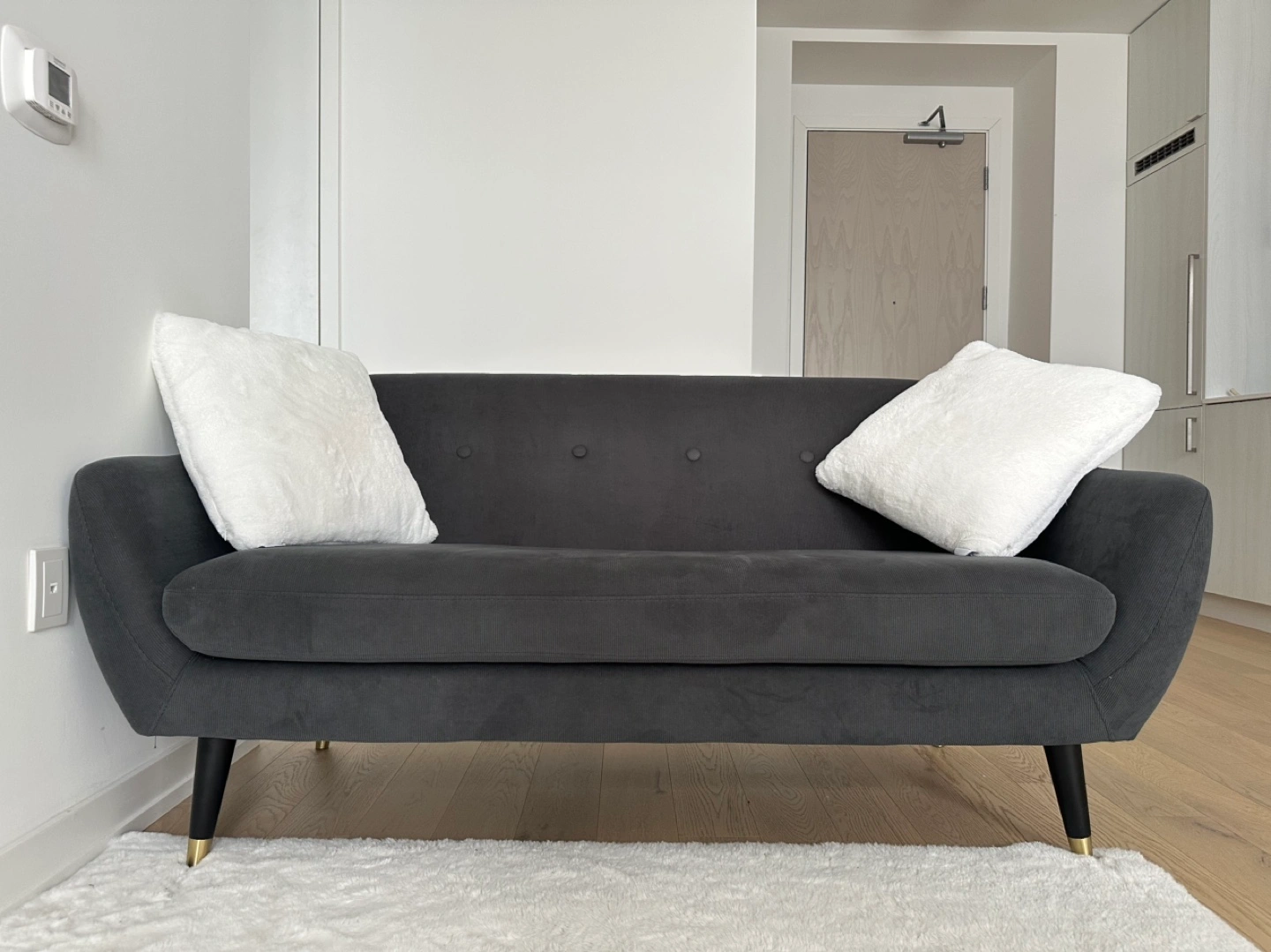 2.5 ppl two-seater sofa. Rare dark grey corduroy fabric (not sold by Jysk anymore). Features button tufting and tapered black legs with gold accents. Very comfortable and cozy. Perfect condition. Can help arrange transportation around Toronto for $20 or ask for GTA. :)