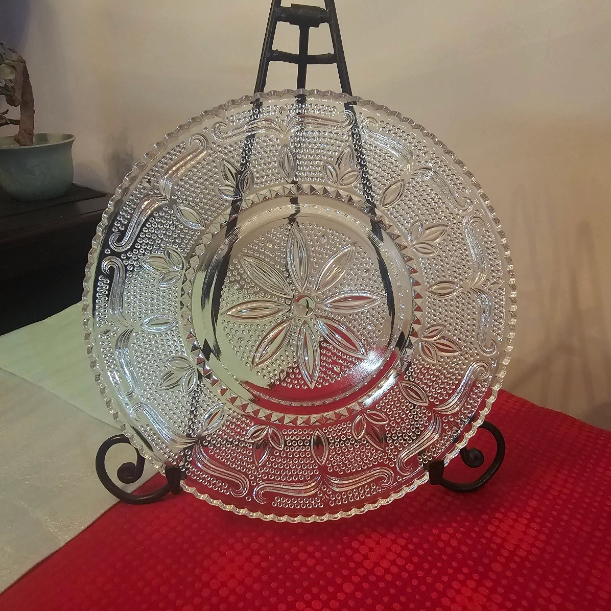 Pattern: The "Heritage Clear" pattern features hobnails, a floral center, and decorative scrolls.