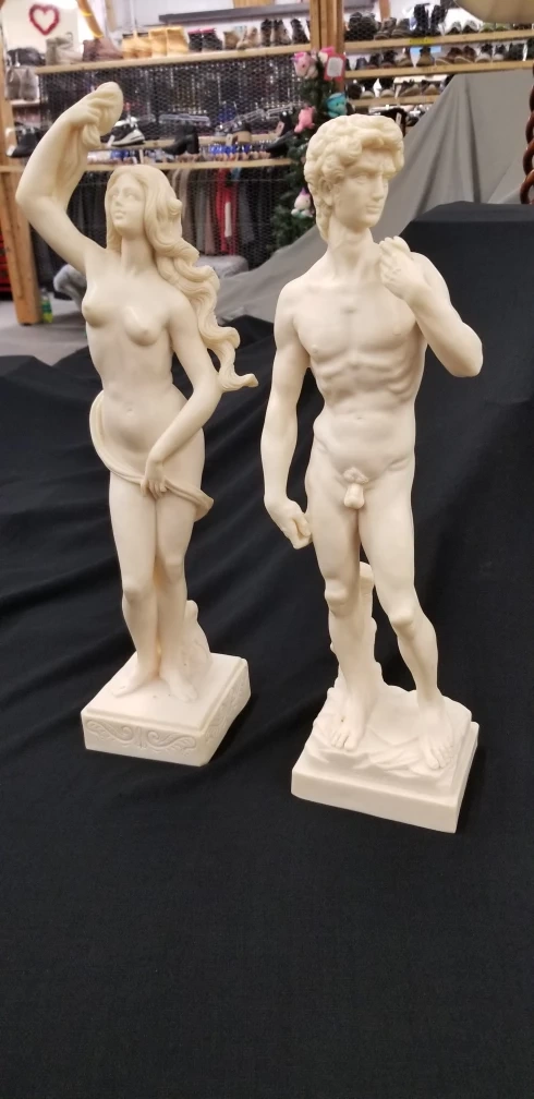 Man and woman, Roman style statues , 1960s . Made in Italy . 19 inches tall . Made of crushed alabaster and resin . Great condition , no defects . Cash payment please , thanks for looking .