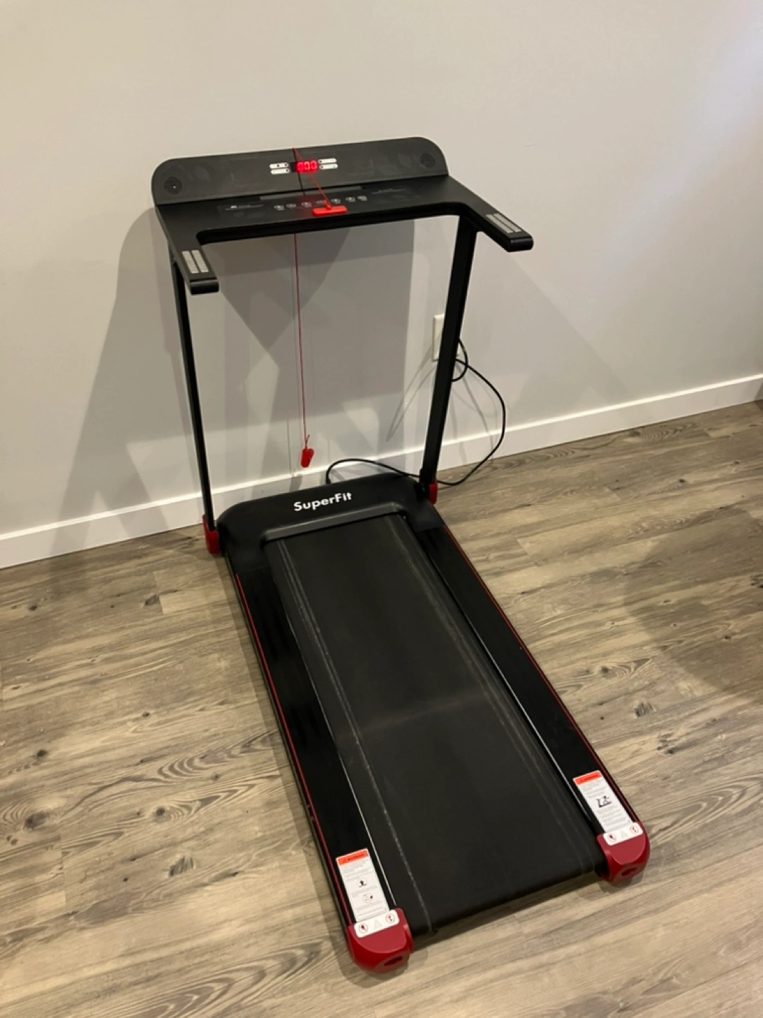 Compact treadmill, perfect for home workouts. Features a digital display showing speed, time, distance, and calories burned. Includes safety clip. Easy to store. Must pick up.