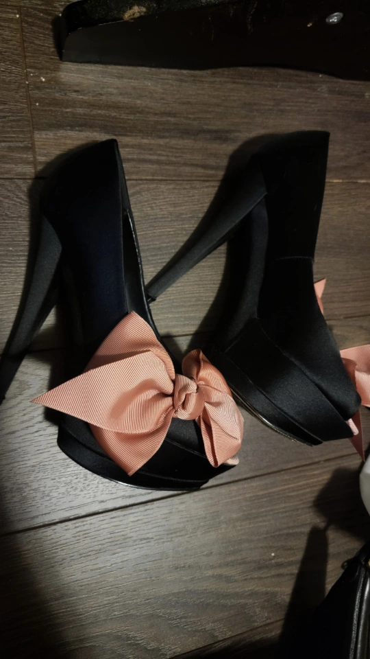 1000+Elegant black satin heels. Blush coloured grosgrain ribbon bow detail. Stilleto heels with peep toe.