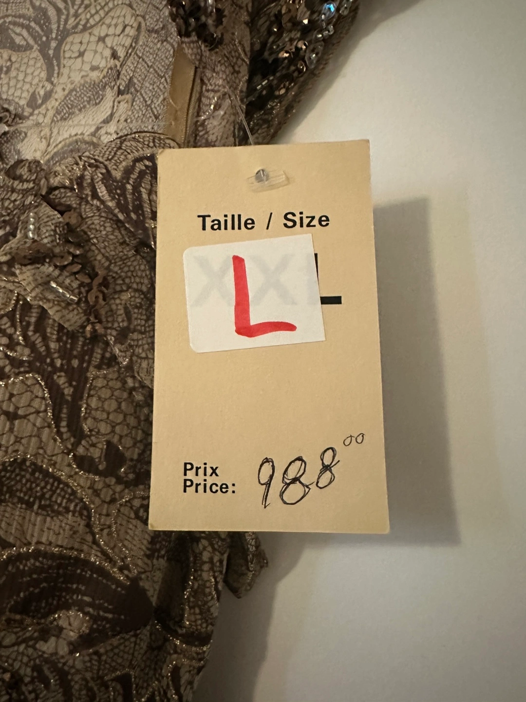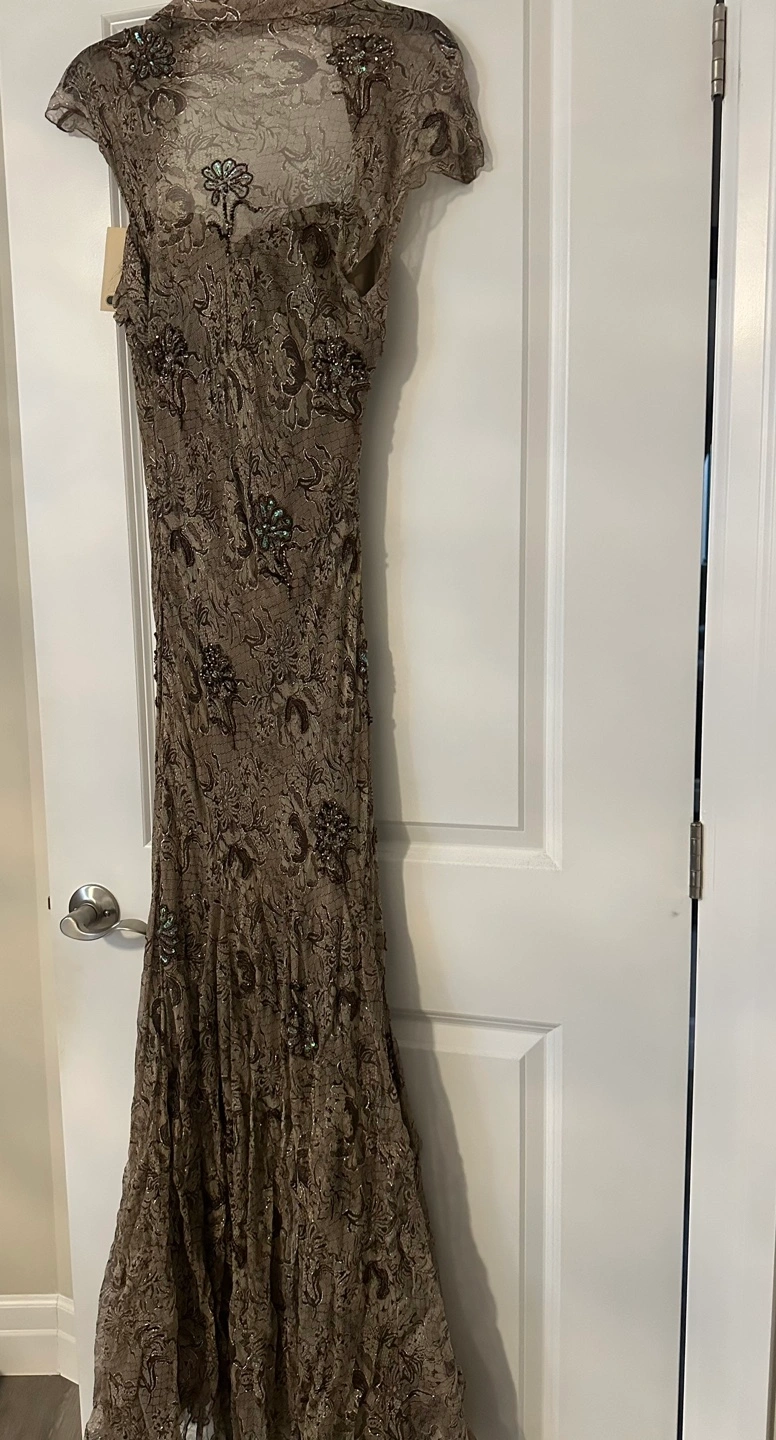 Gorgeous taupe gown. Features short sleeves, a sweetheart neckline, and intricate lace detailing. Embellished with shimmering beads and sequins. Floor-length, a-line silhouette.
