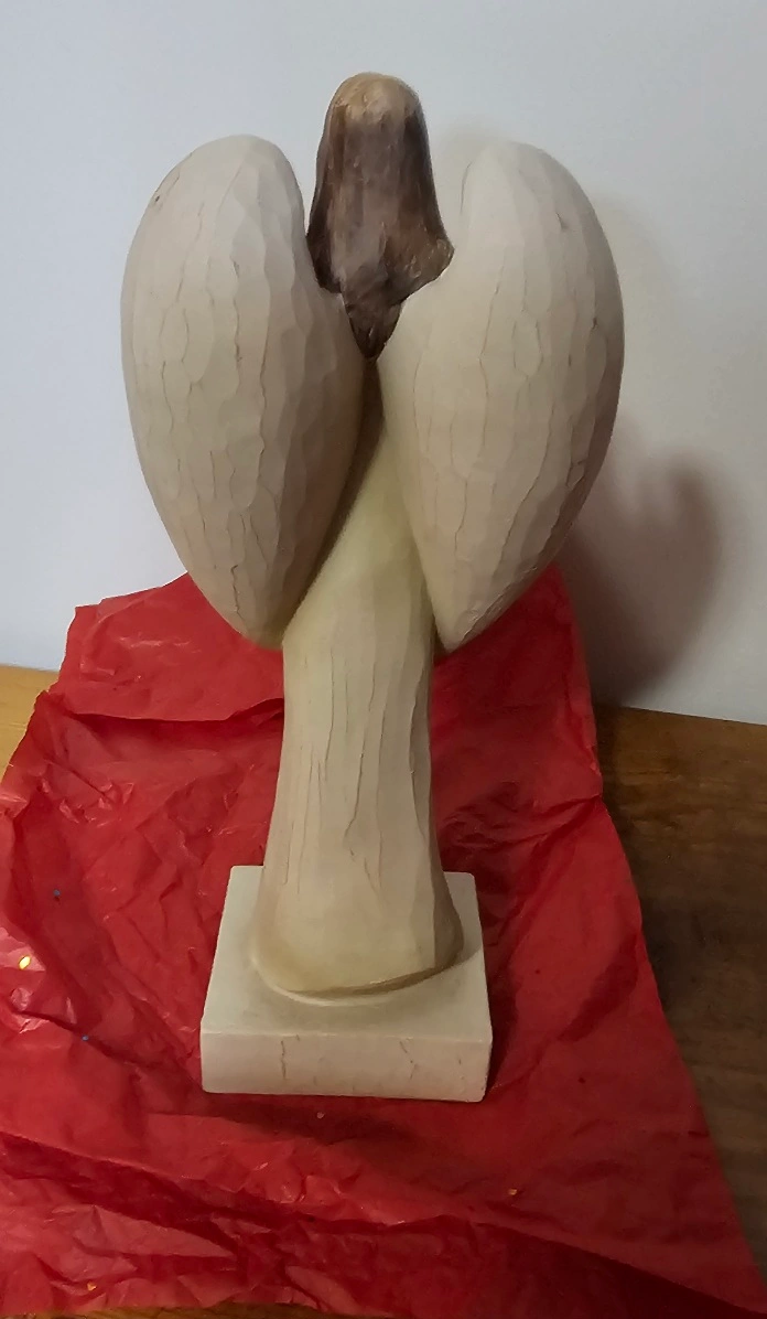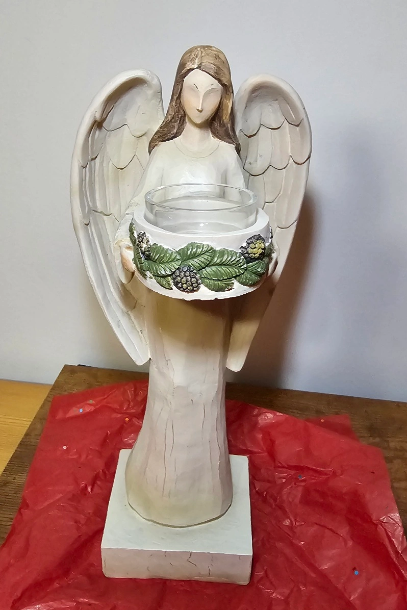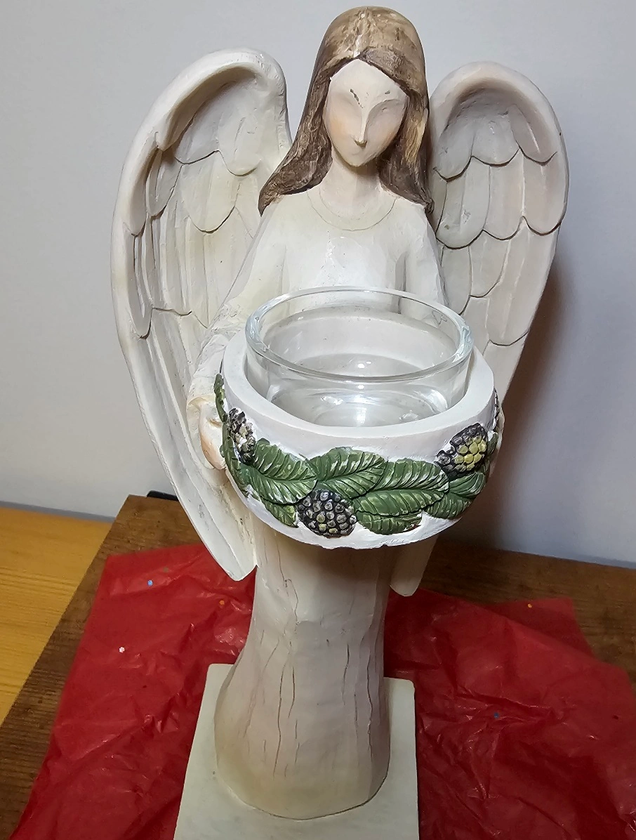 Lovely angel statue candle holder. The angel candle holder appears to be made of resin and features a glass insert for a candle. It is adorned with a wreath of leaves and berries around the candle holder portion and has a neutral color palette with detailed wings and a serene expression. These types of candle holders can be used in home decor, religious settings, or as memorial pieces. Length (approx): 12cm Width (approx): 10.5cm Height (approx): 29cm *Located on 57 Ave Sw at Elbow Dr SW. The Exact Address is provided once pickup time is booked and confirmed.