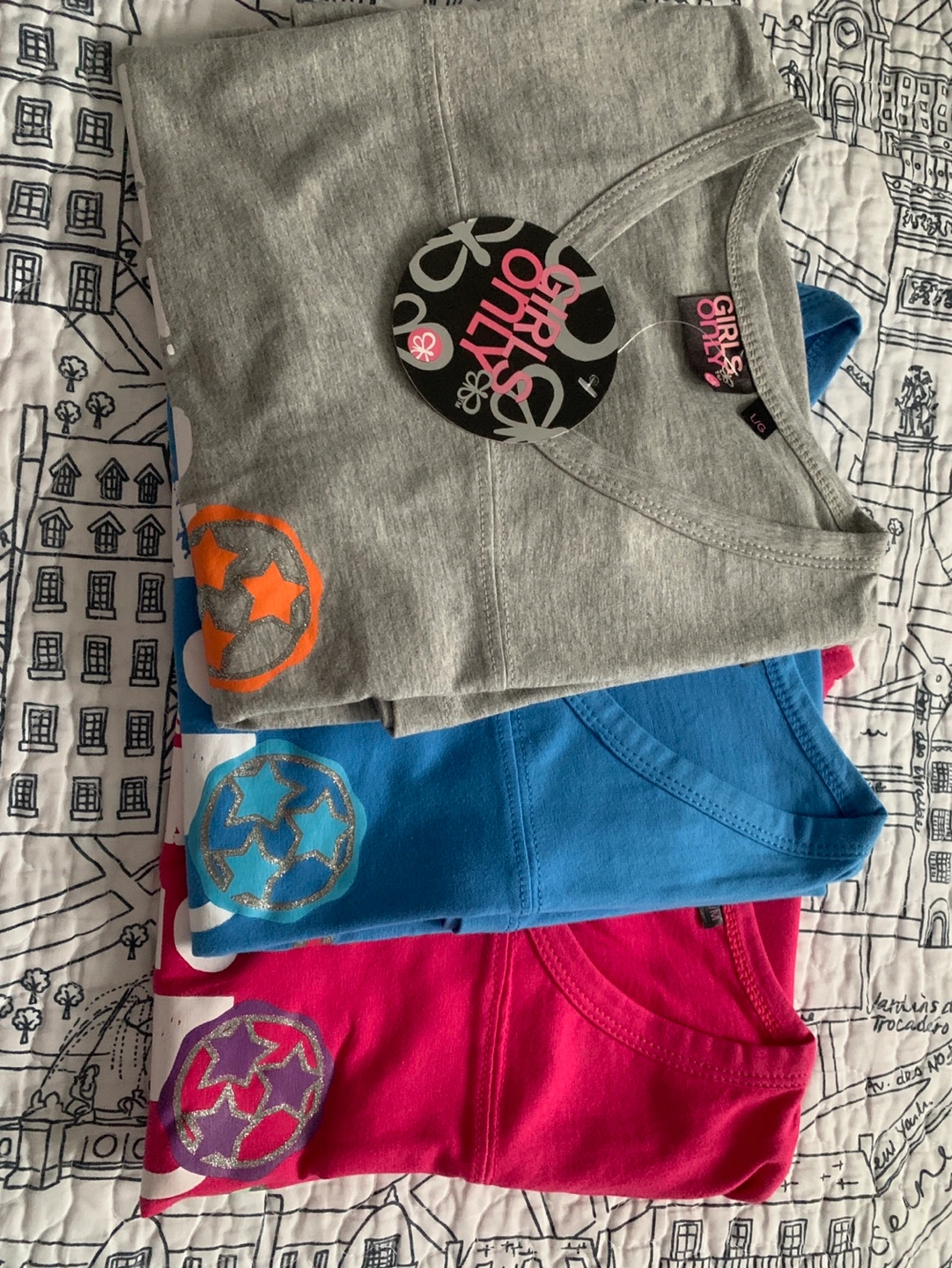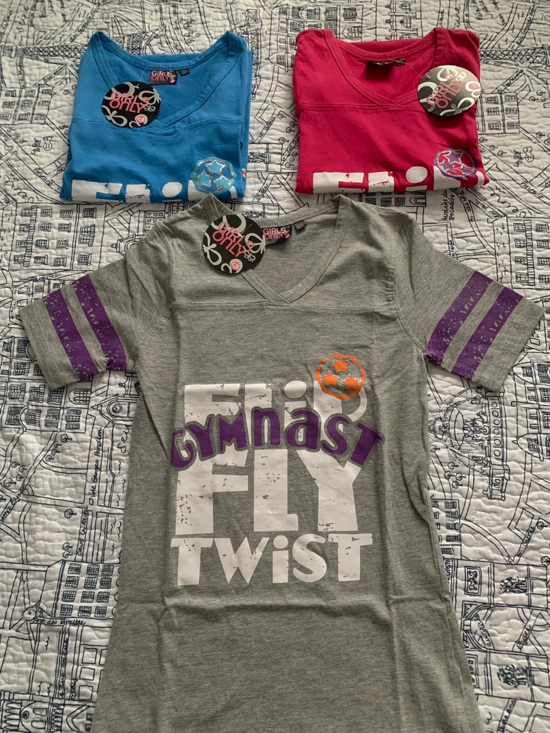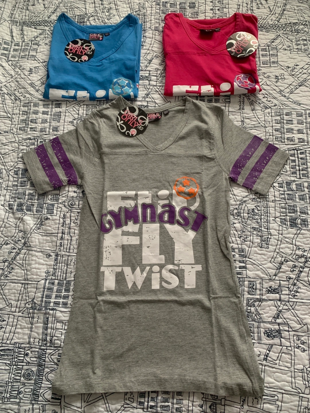 $5 each! Three Girls Only brand t-shirts. V-neck, short sleeve. Grey shirt features gymnastics-themed text. Blue, Grey and pink shirts feature similar design. Size 10.