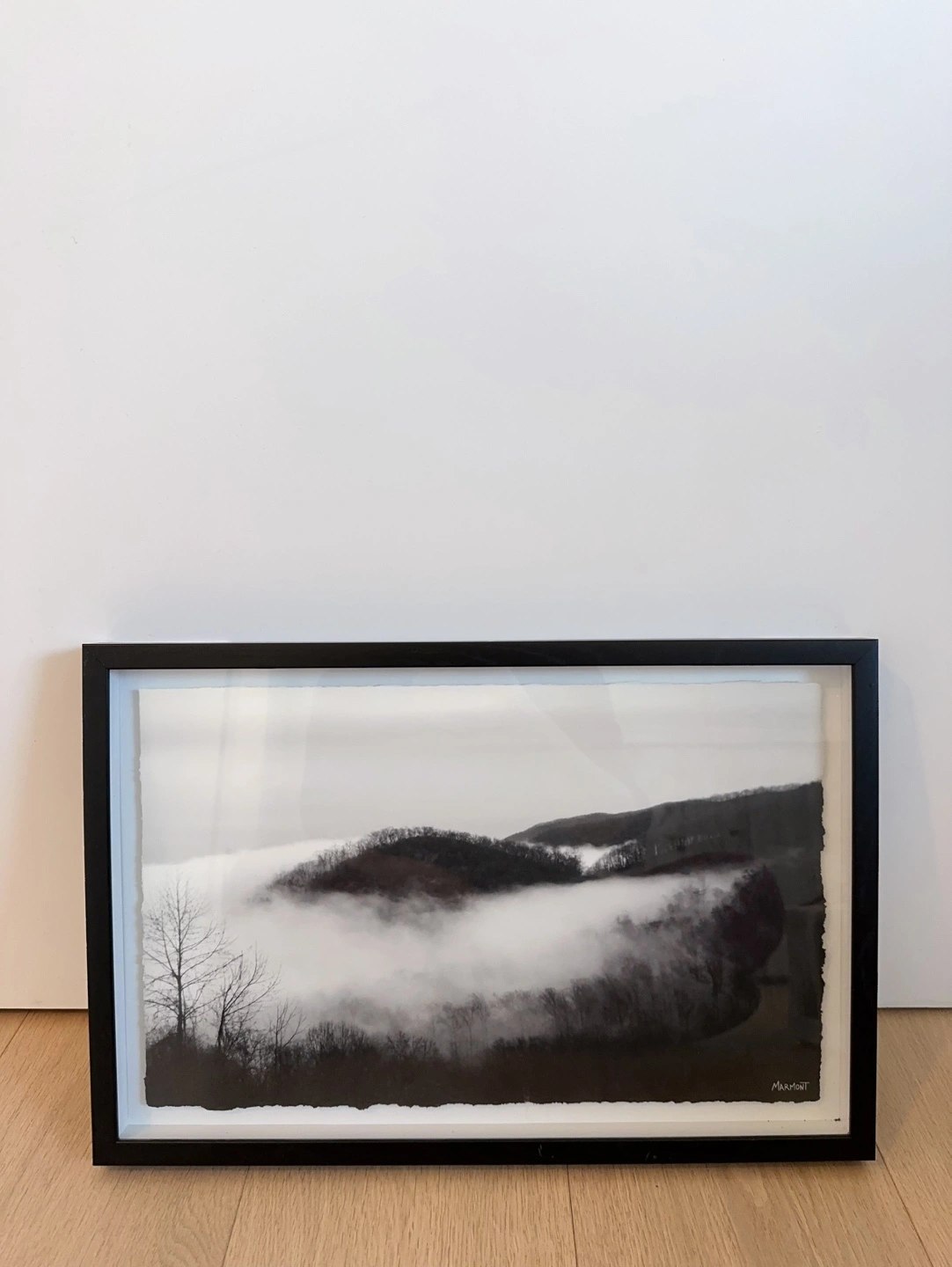 Black and white landscape print in a black frame. Foggy mountain scene. Artist signature visible. Ready to hang.