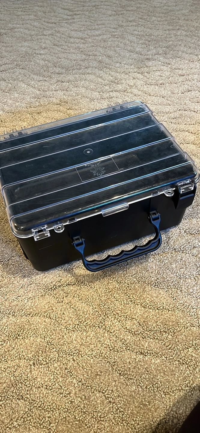 Durable plastic storage container. Features a clear lid and a convenient carrying handle. Ideal for organizing small items. One latch is broken priced accordingly