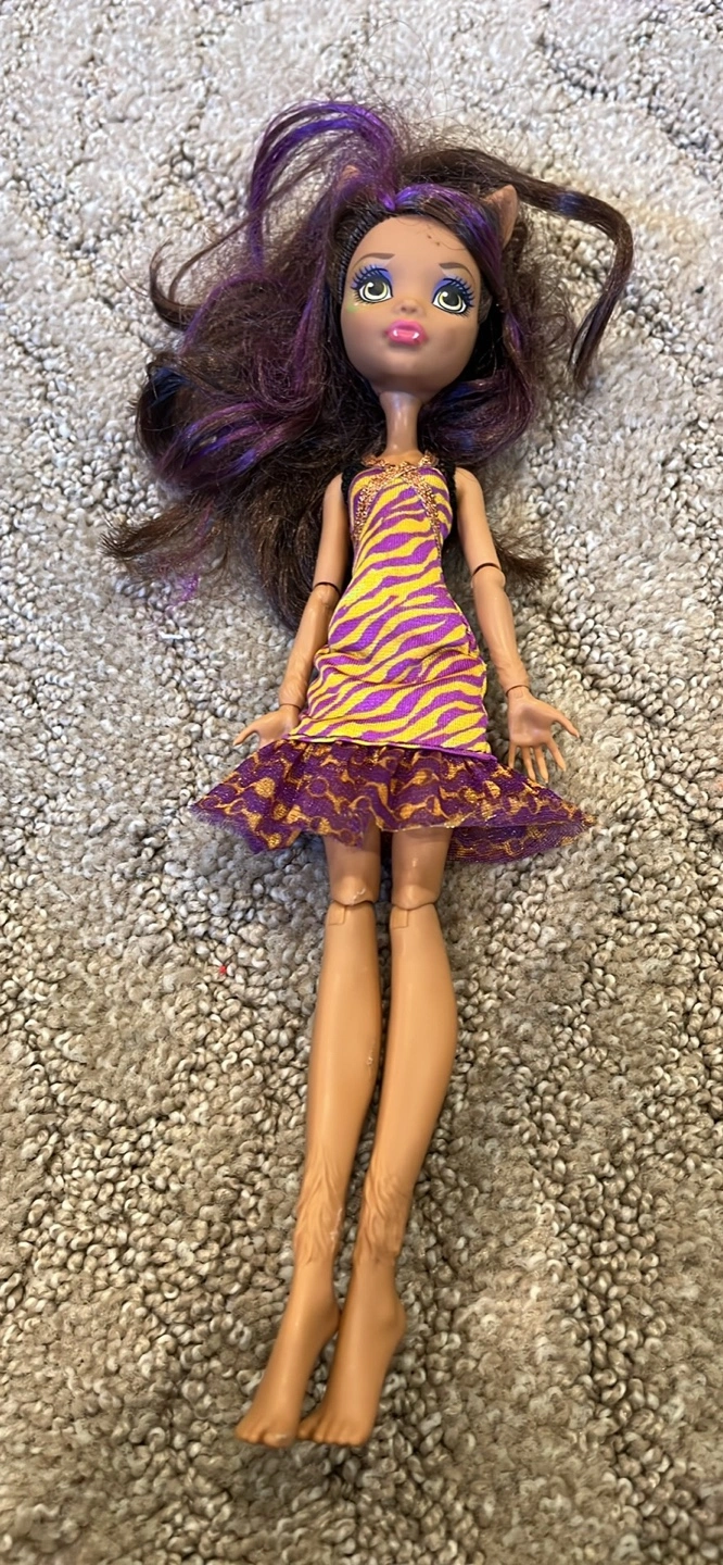 Clawdeen Wolf doll. Brown and purple hair. Yellow and purple striped dress. Posable joints.