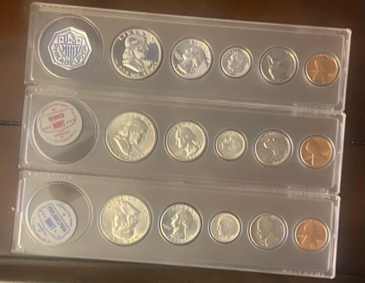 20Three sets of circulated US coins from 1964. Each set includes a penny, nickel, dime, quarter, and half-dollar. Coins housed in clear plastic holders. Includes Denver and Philadelphia mint marks.