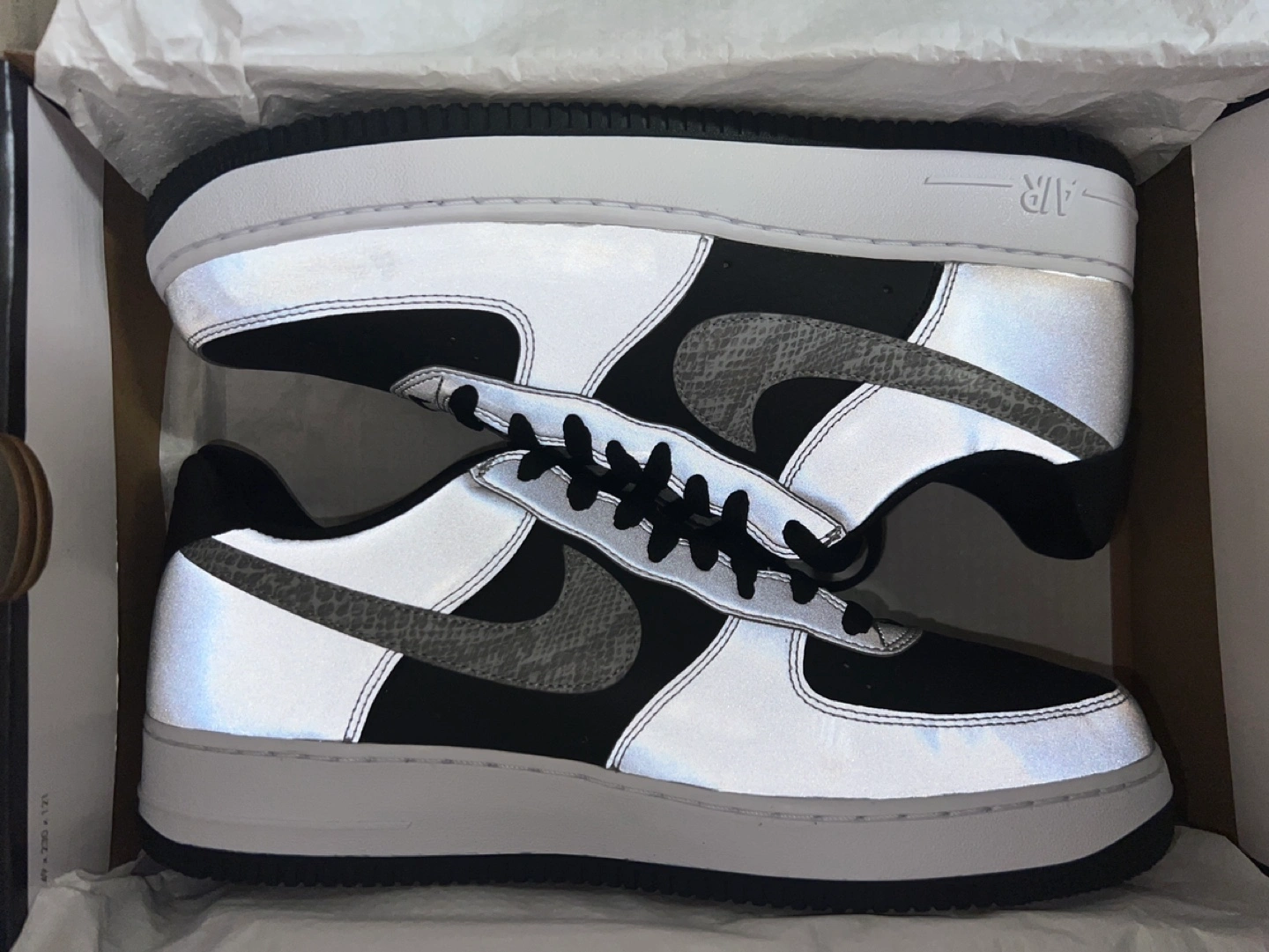 5Men's Nike Air Force 1 '07. Reflective material. Snakeskin print. Black and silver colourway. New in box.