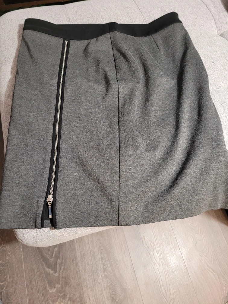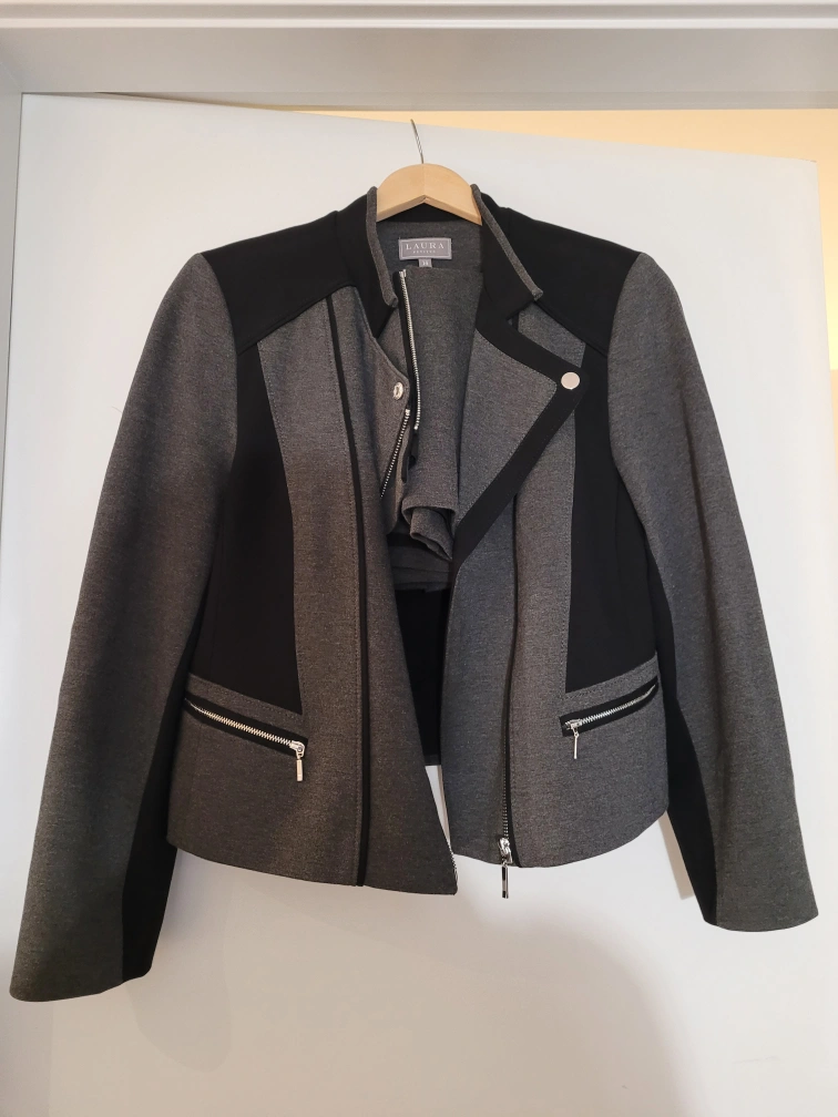 Stylish two-piece outfit. Grey and black colour block design. Moto jacket features asymmetrical zipper closure and zippered pockets. Matching pencil skirt with side zipper. Excellent for work or a night out. Jacket size 14, skirt size 12.