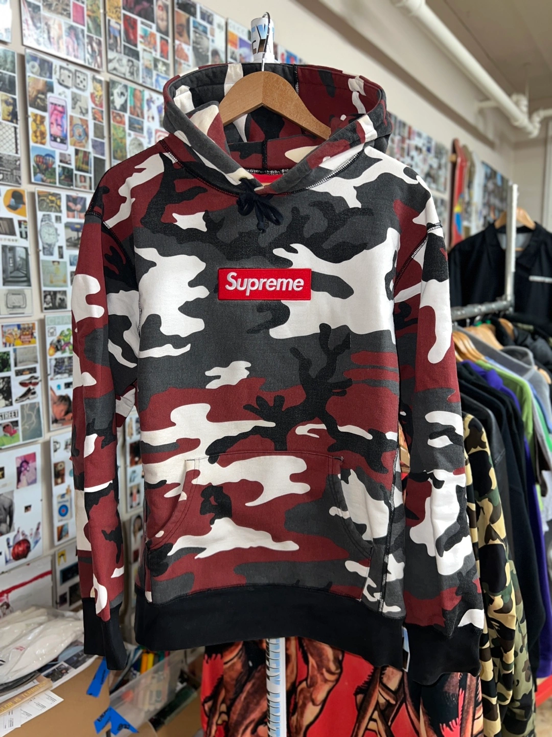 5Men's Supreme hoodie. Red, white, and black camouflage print. Box logo. Long sleeves, kangaroo pocket. Good condition.
