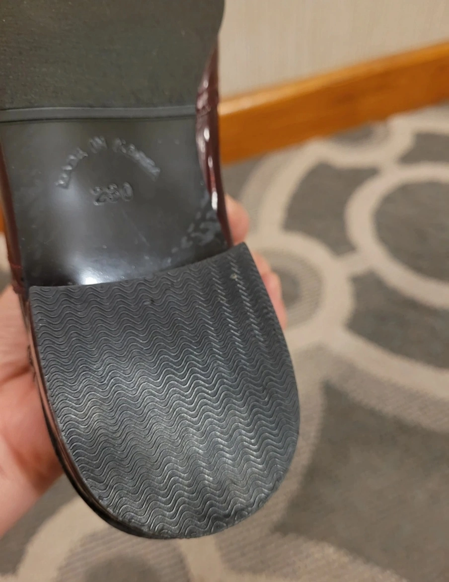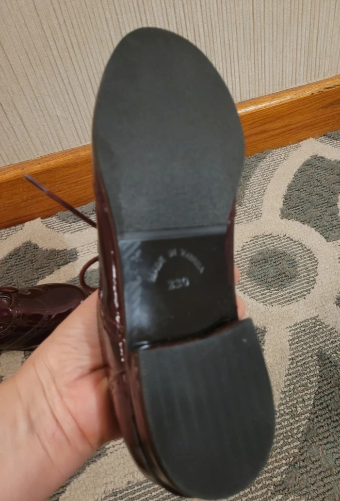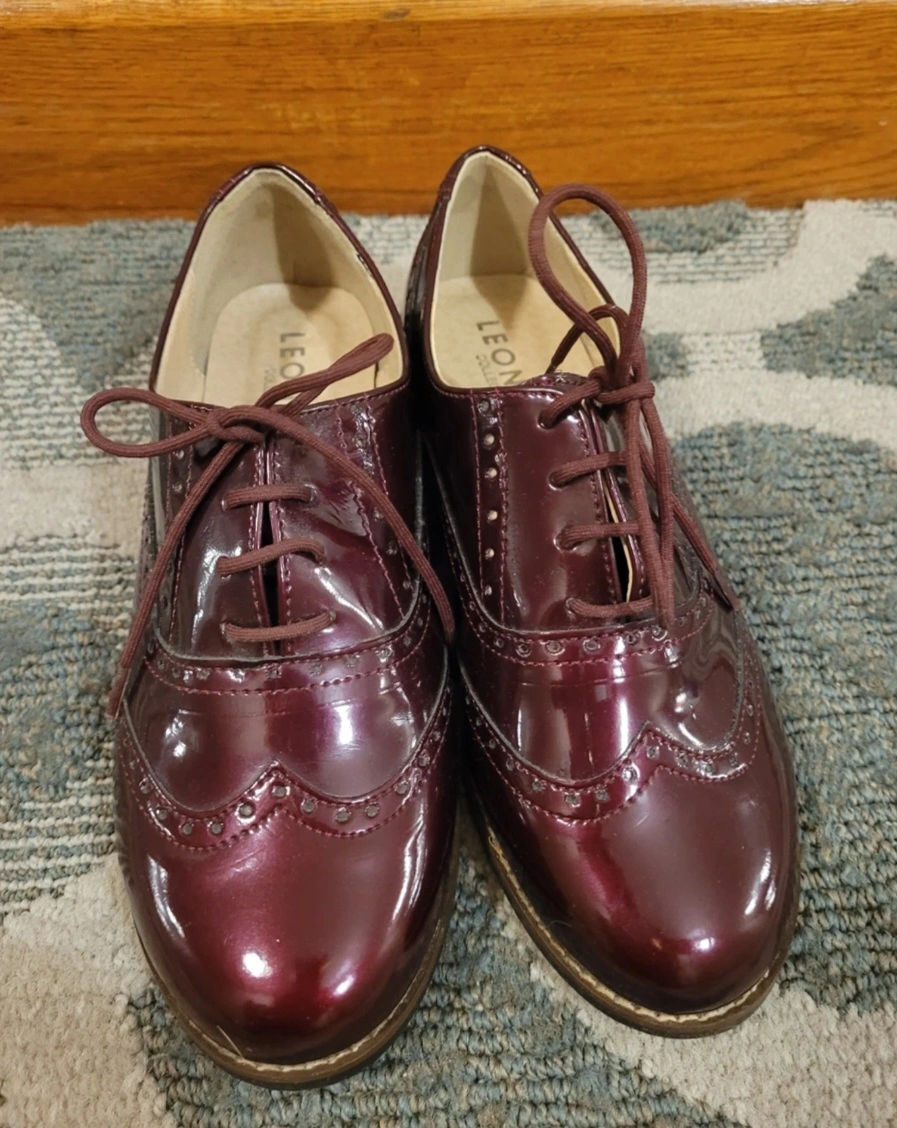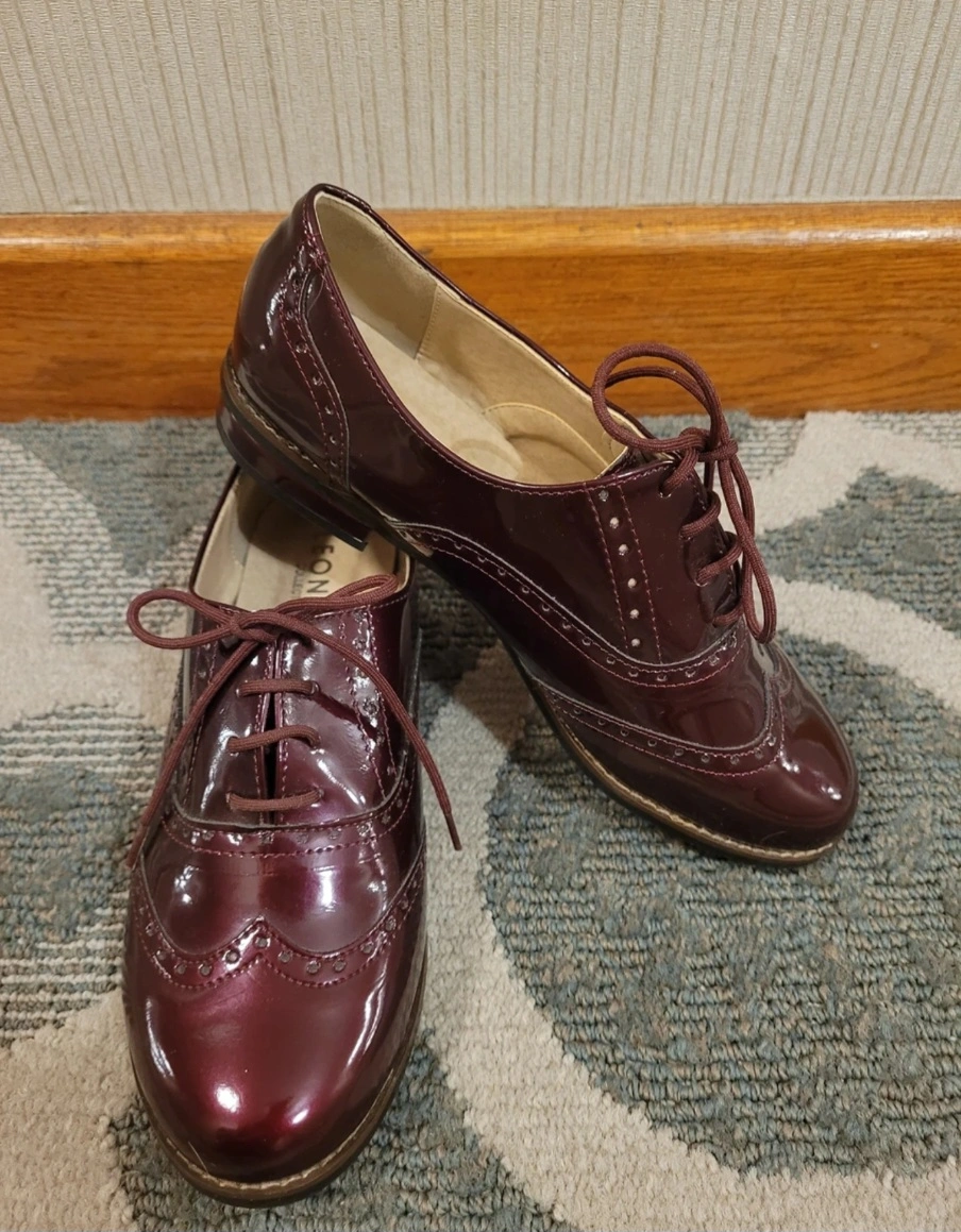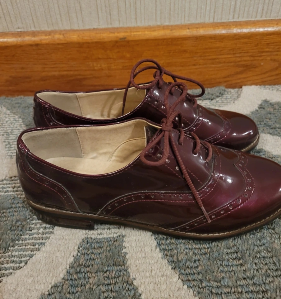 Burgundy patent leather oxfords. Lace-up closure. Brogue detailing. Size 230. Made in korea