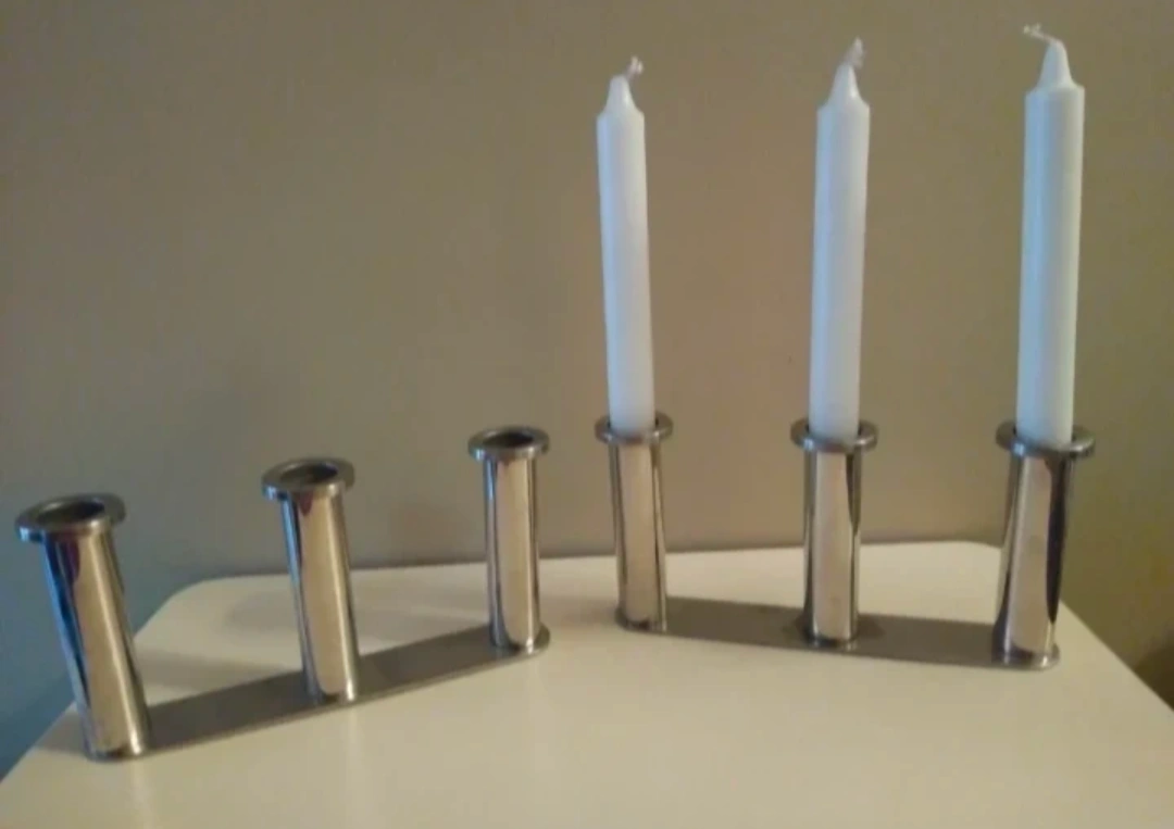 Two identical tabletop chrome candle holders hold three candles each. $10 for both. Give your dining table a touch of elegant ambiance! Great for a wedding table setting.