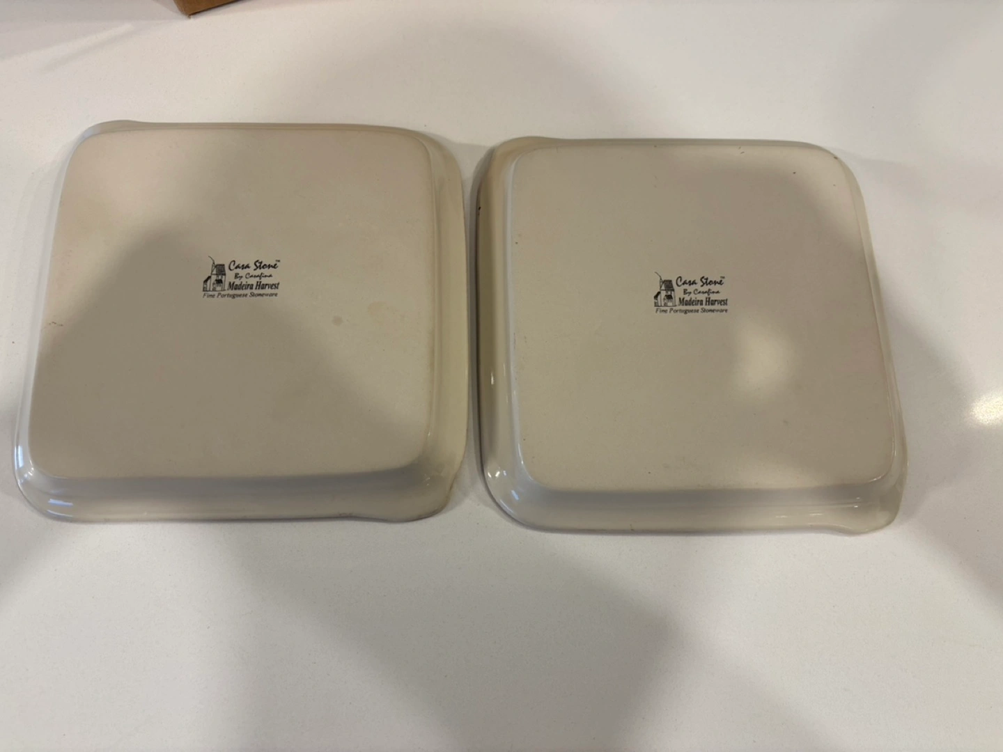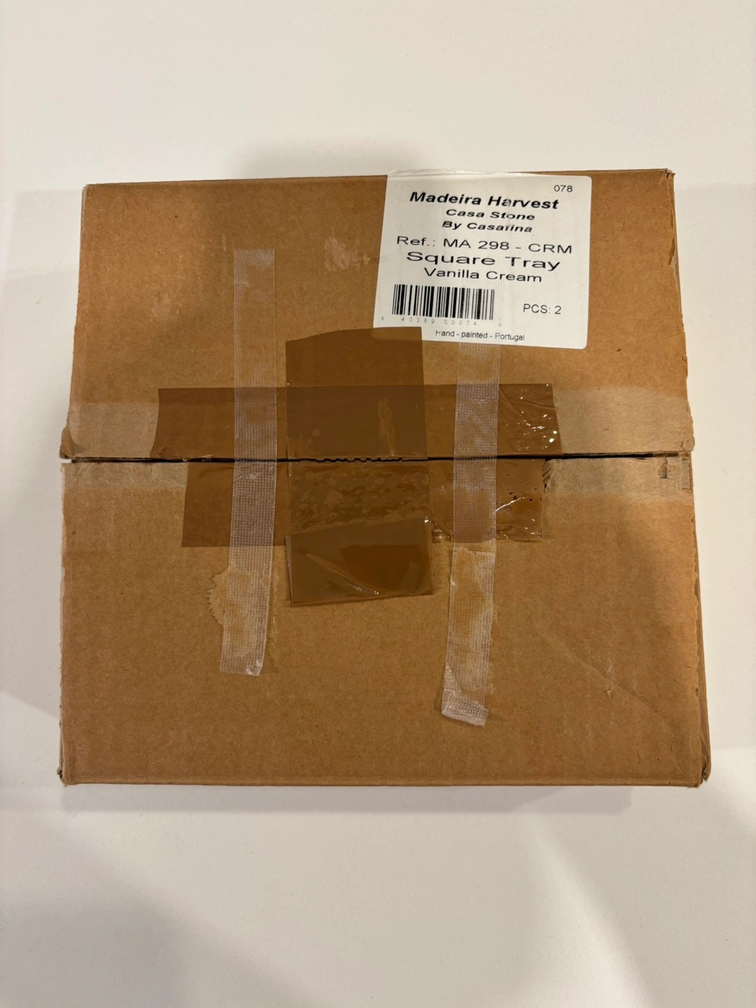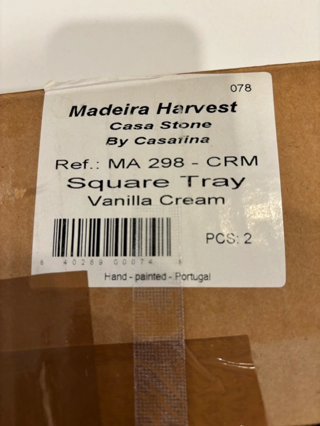 15Brand New Set of Two Madeira Harvest Casa Stone Square Trays For Sale. Brand new - still on original packaging. Vanilla cream colour. Hand painted in Portugal. Dimensions are 8” x 8”. East Regina pick up. Listed on other sites.