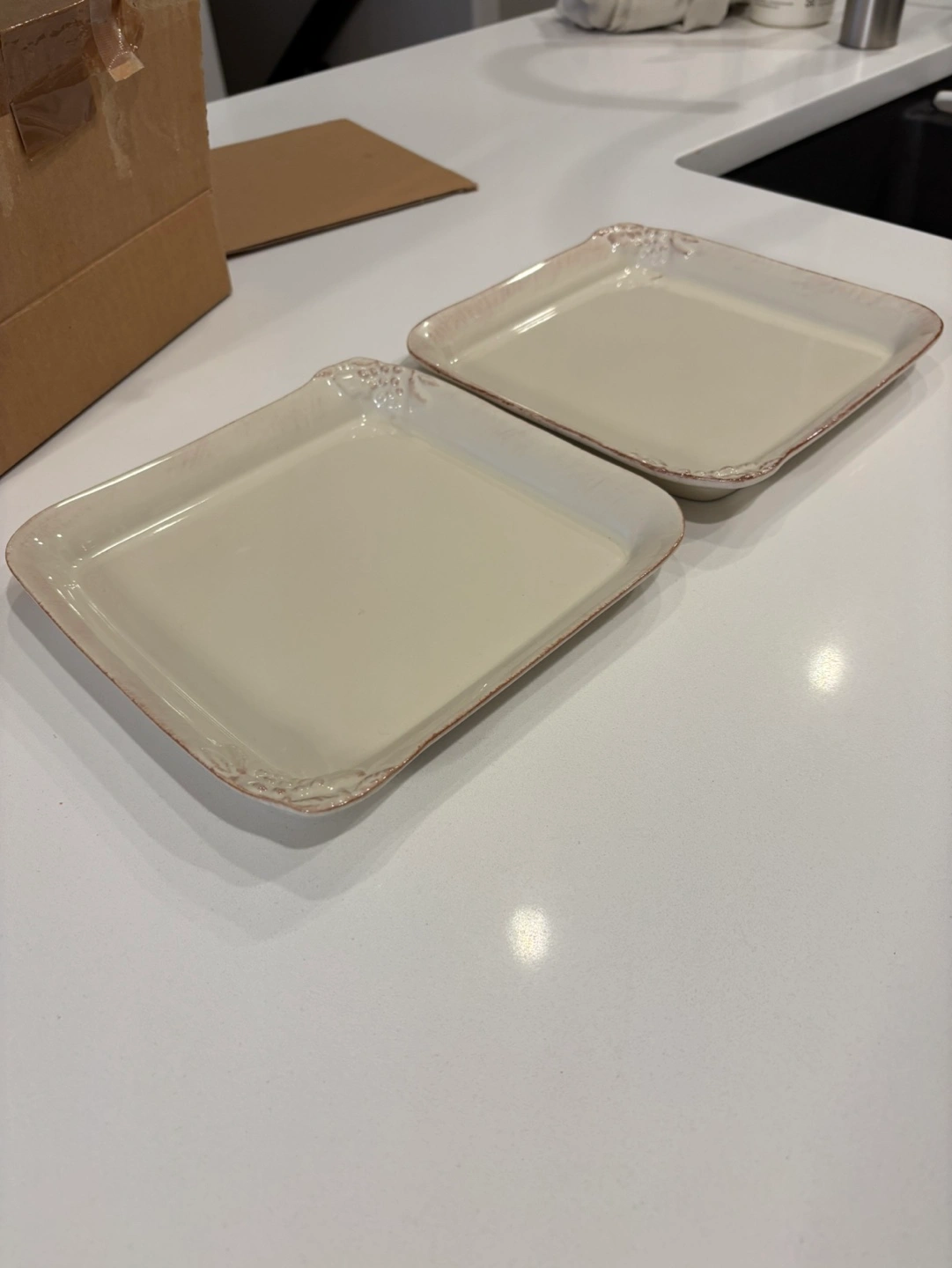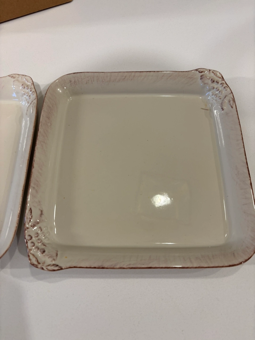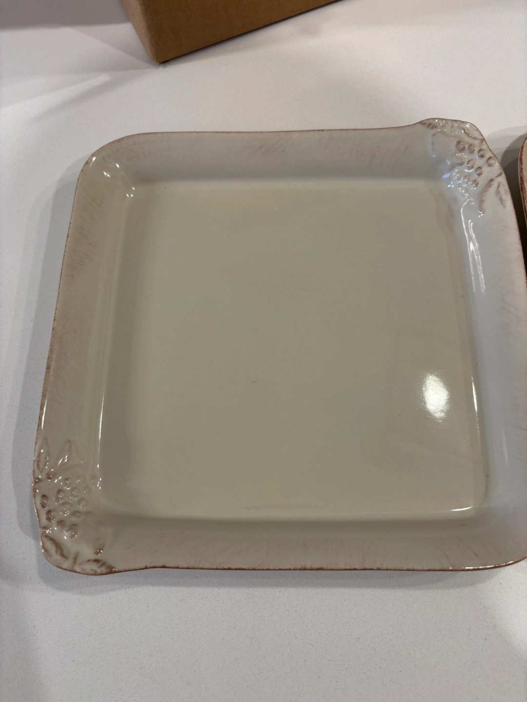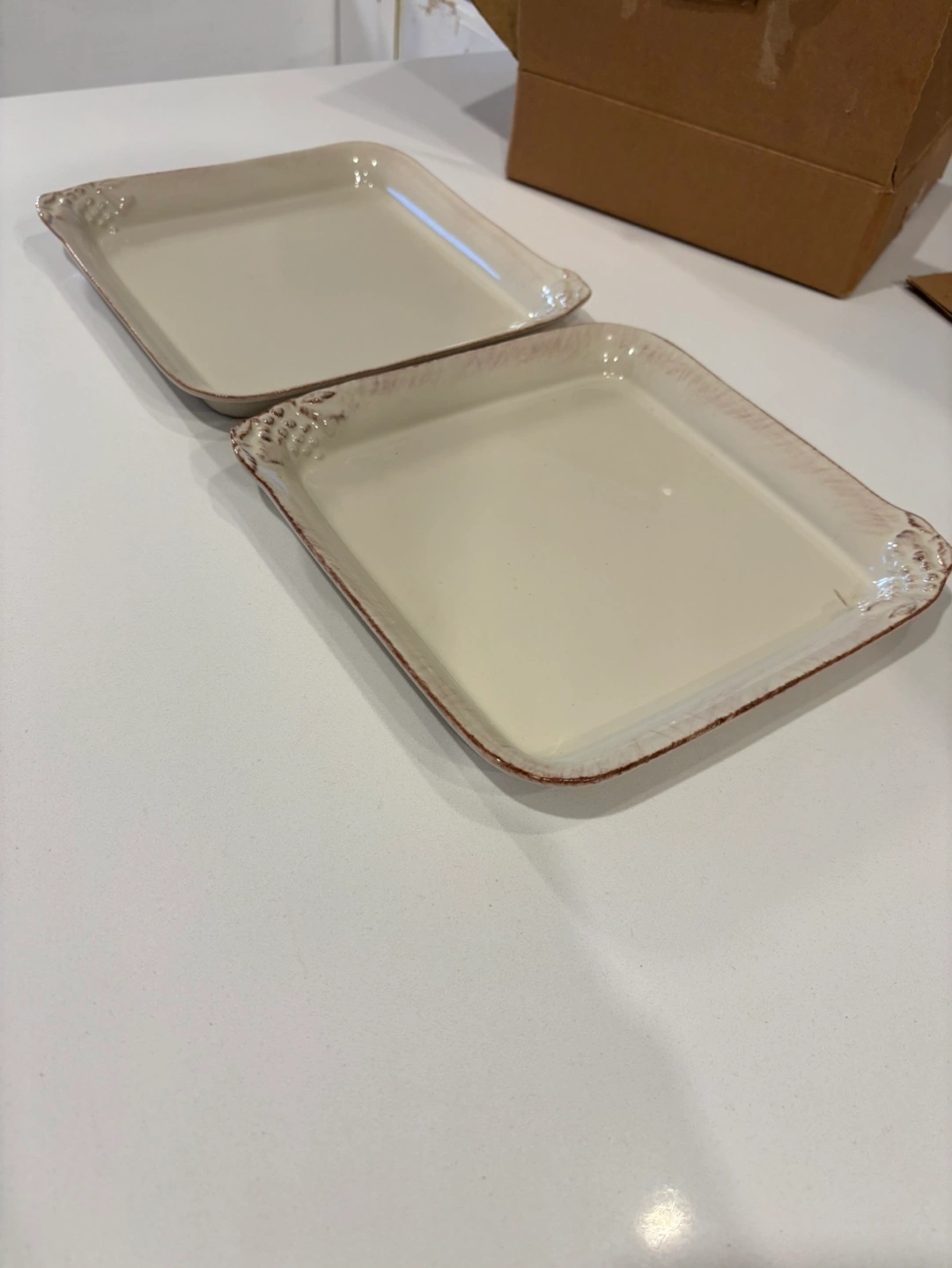 15Brand New Set of Two Madeira Harvest Casa Stone Square Trays For Sale. Brand new - still on original packaging. Vanilla cream colour. Hand painted in Portugal. Dimensions are 8” x 8”. East Regina pick up. Listed on other sites.