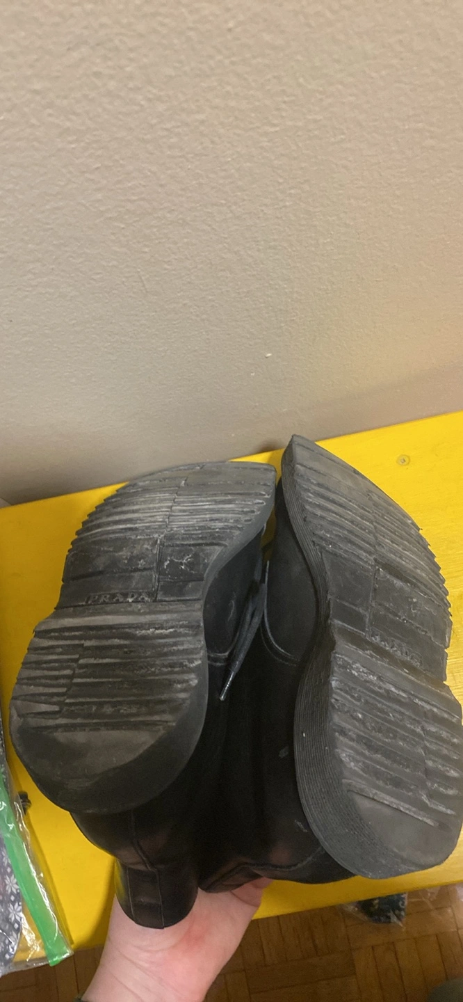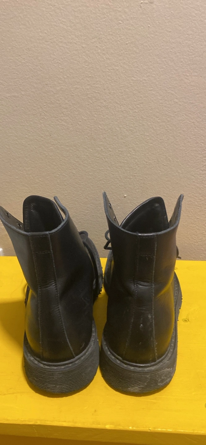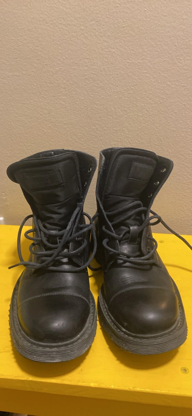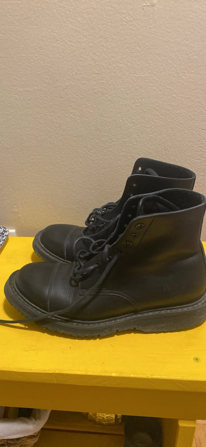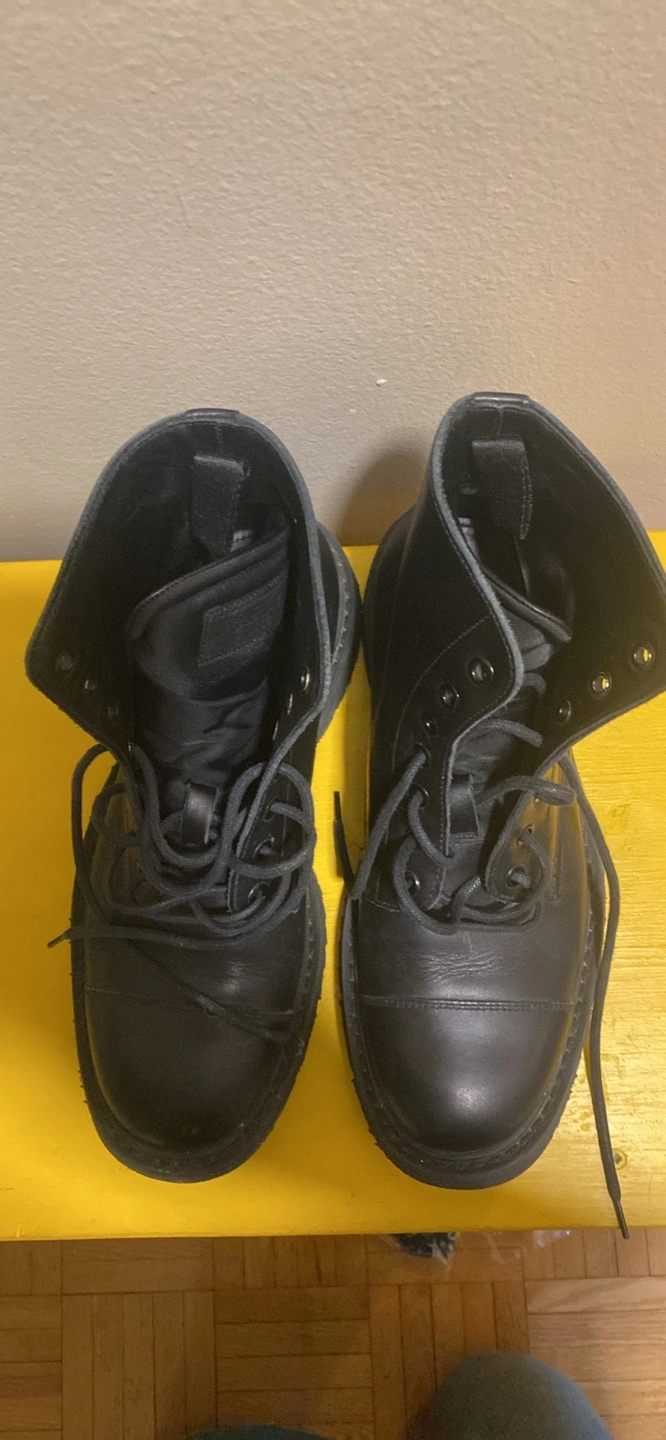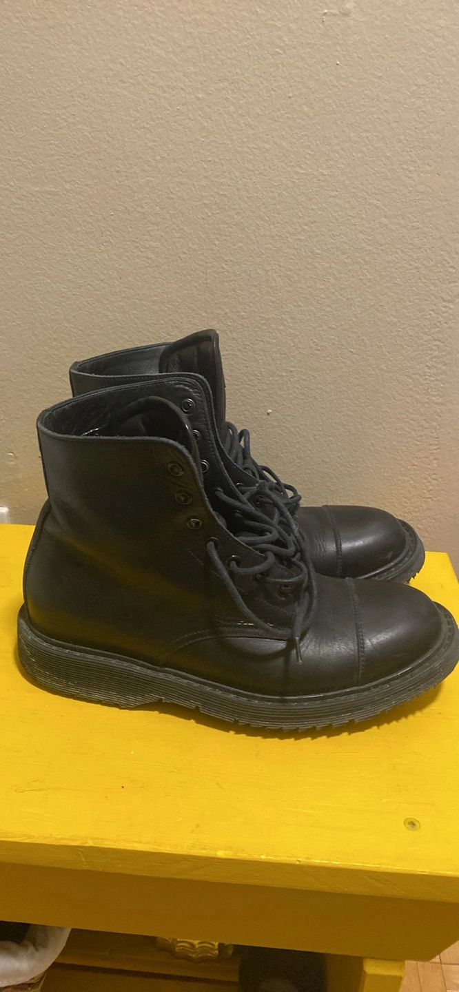 13Pair of black leather boots. Lace-up closure. Round toe. Thick sole. Ankle-height.