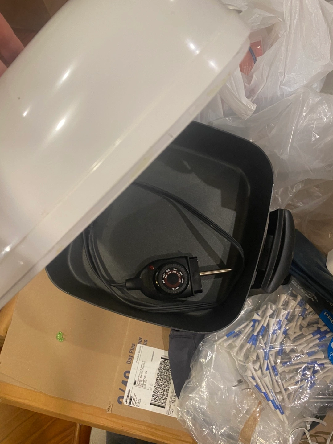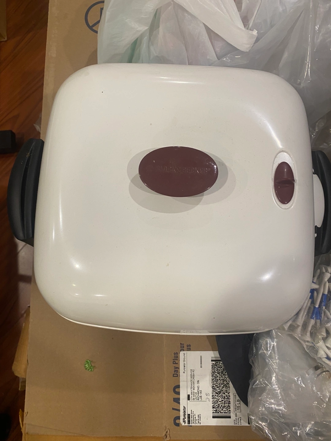 13White electric skillet with a dark grey interior and a removable lid. Features a temperature control knob. Cord included.