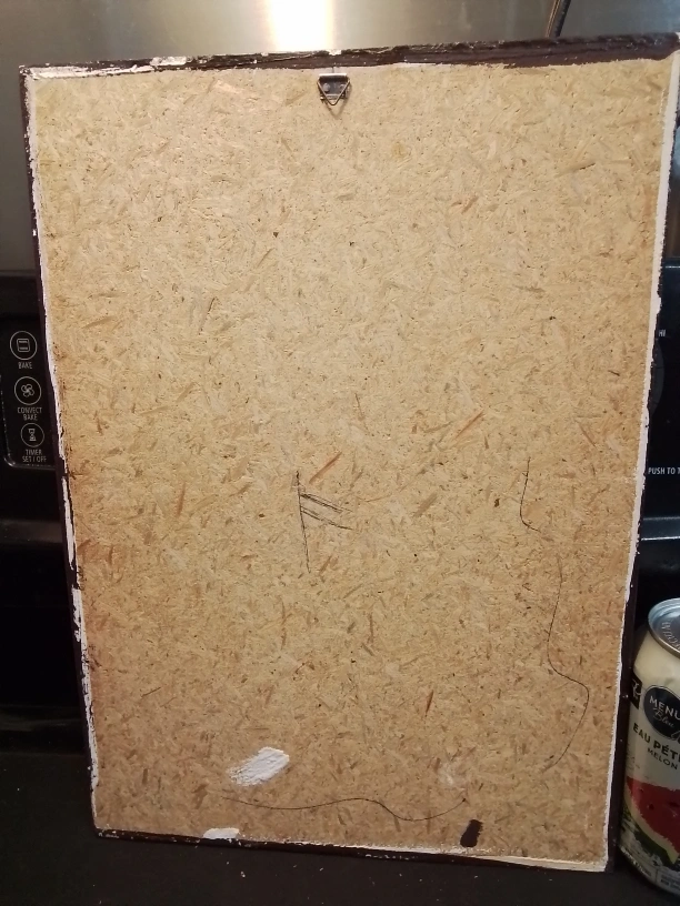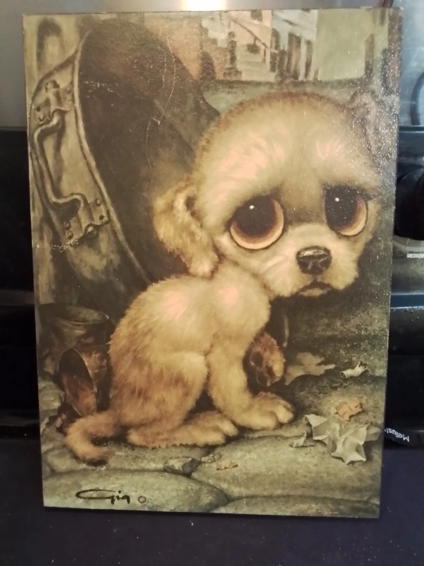Big Eyes Large Boarded. Features a sad-looking puppy sitting beside a garbage can. Dark, vintage colours. Artist signature visible.