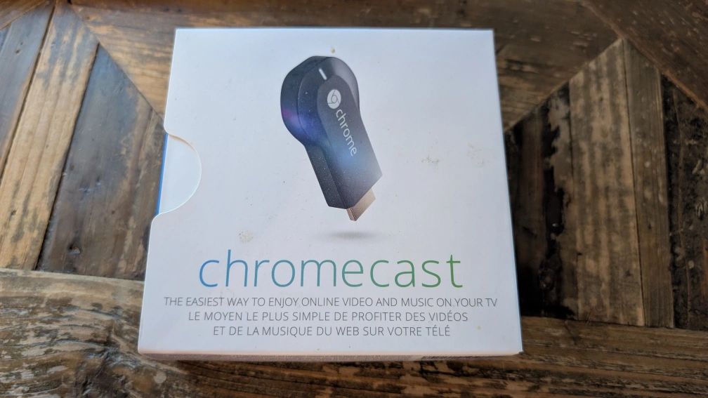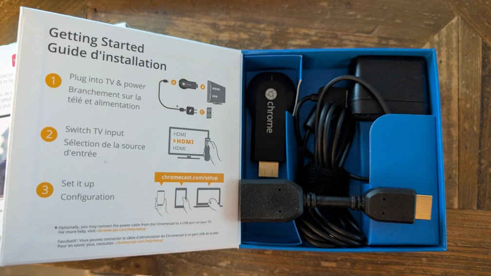 Chromecast device. Includes HDMI cable and power adapter. Easy setup. Stream online video and music to your TV in 1080p HD resolution.