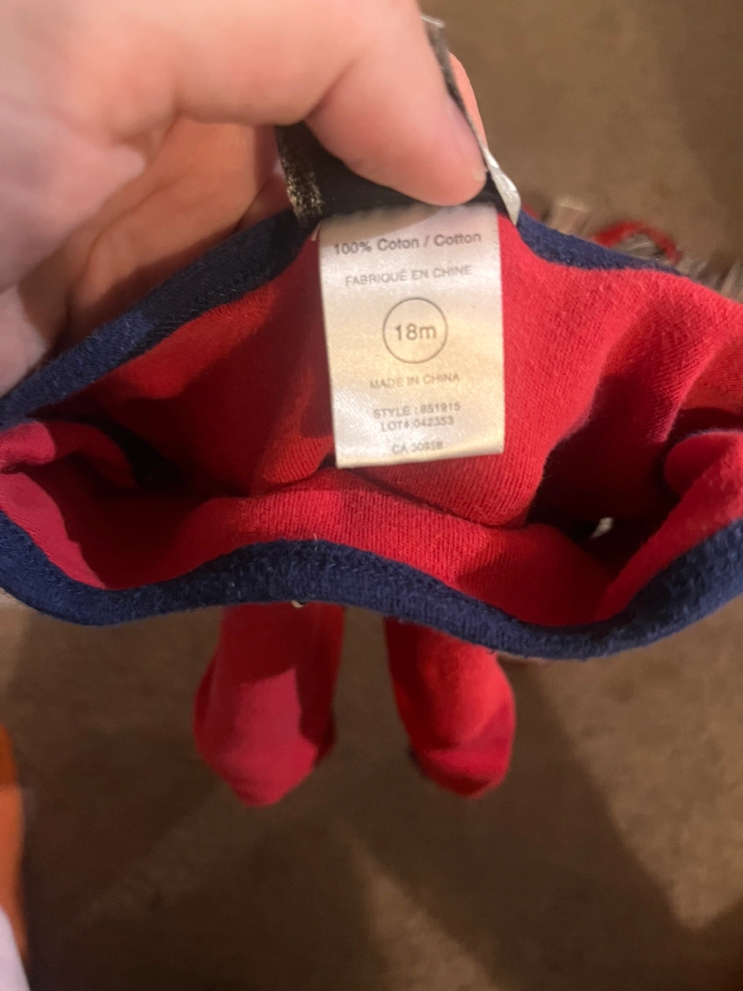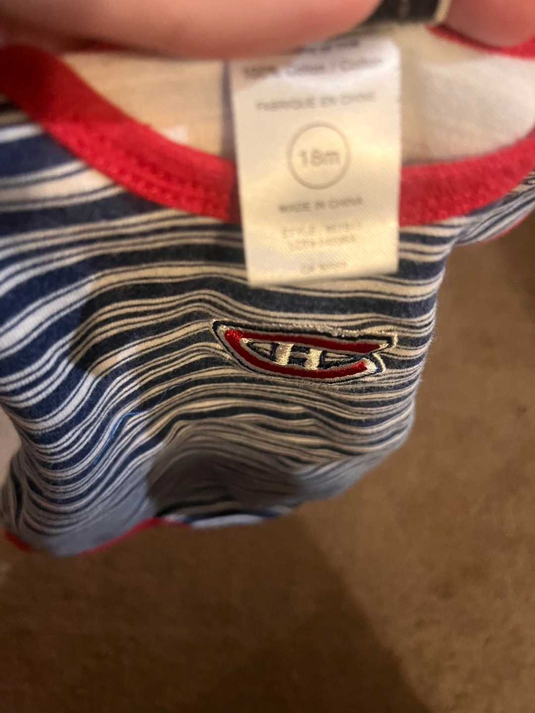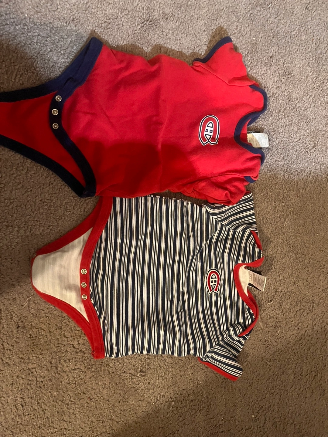 Two 18-month baby bodysuits. One red, one navy and white striped. Both feature a Montreal Canadiens logo. 100% cotton. Made in China.