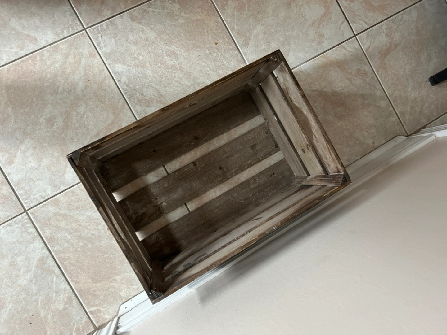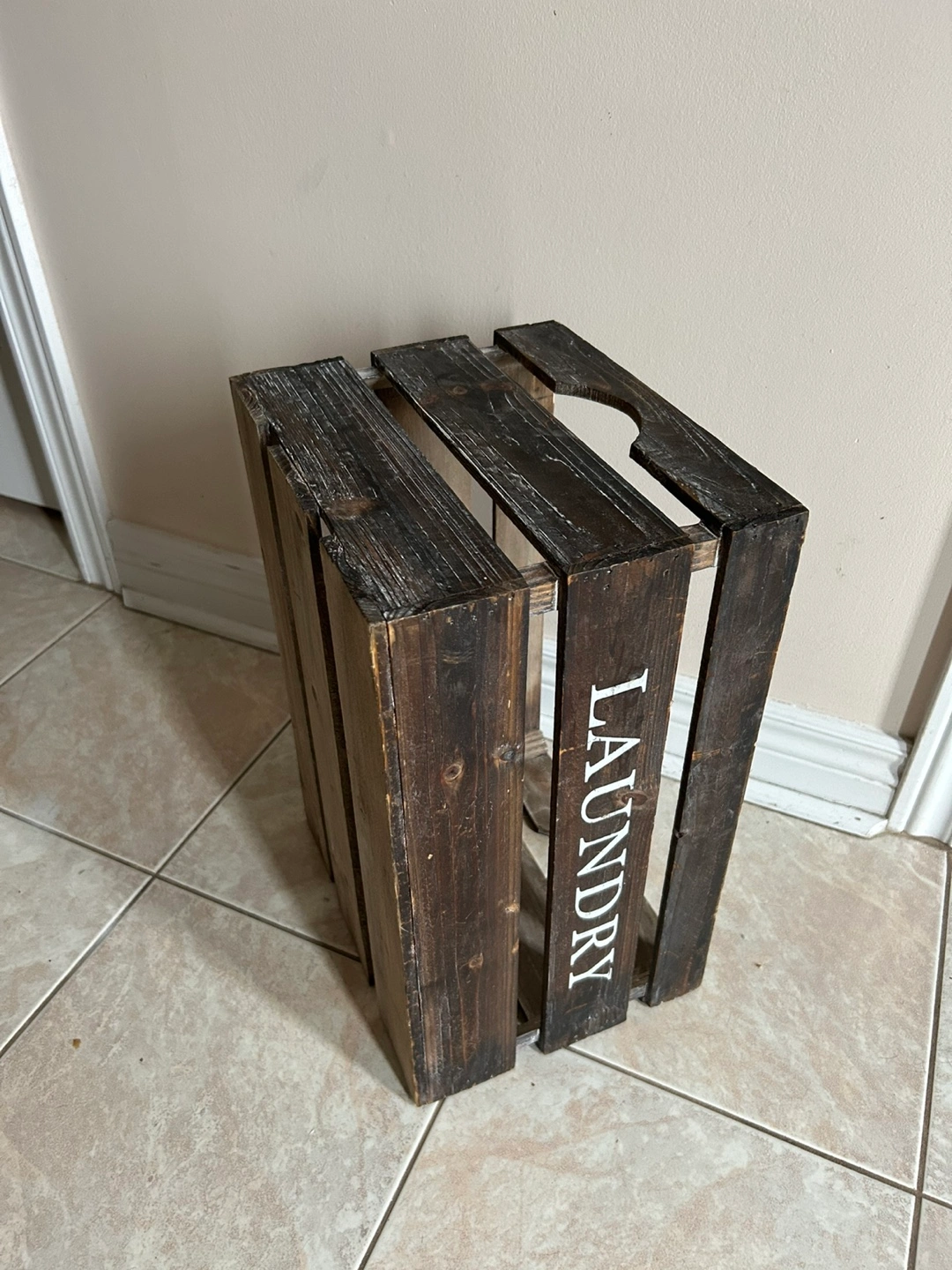 53Dark stained wooden crate. Perfect for laundry, storage, or décor. Features a cutout handle and the word "LAUNDRY" stenciled on the side. Shows some wear.