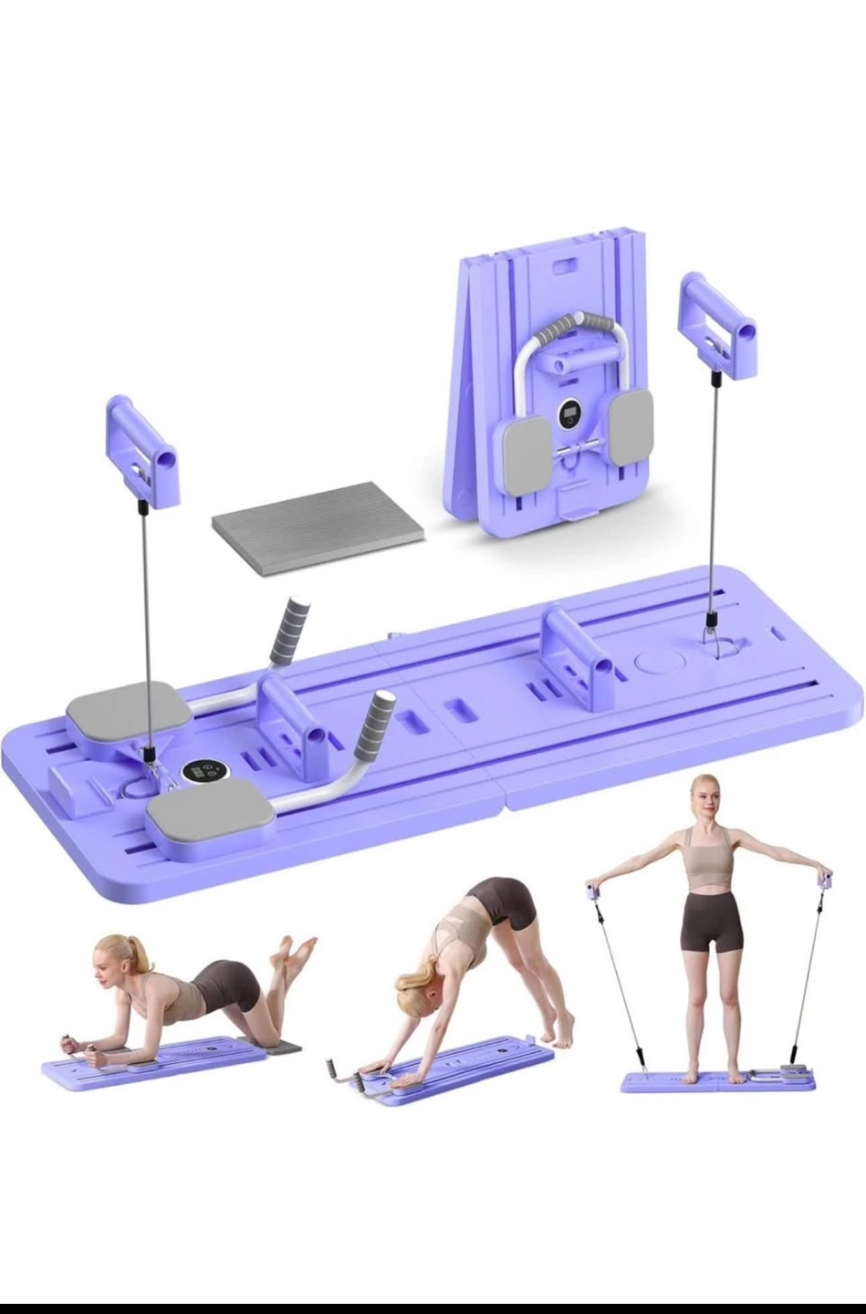 Portable fitness board. Great for core, abs, hip, and back training. Includes resistance bands. Auto-rebound technology. 42 inch extended silent rail. Foldable for easy storage.